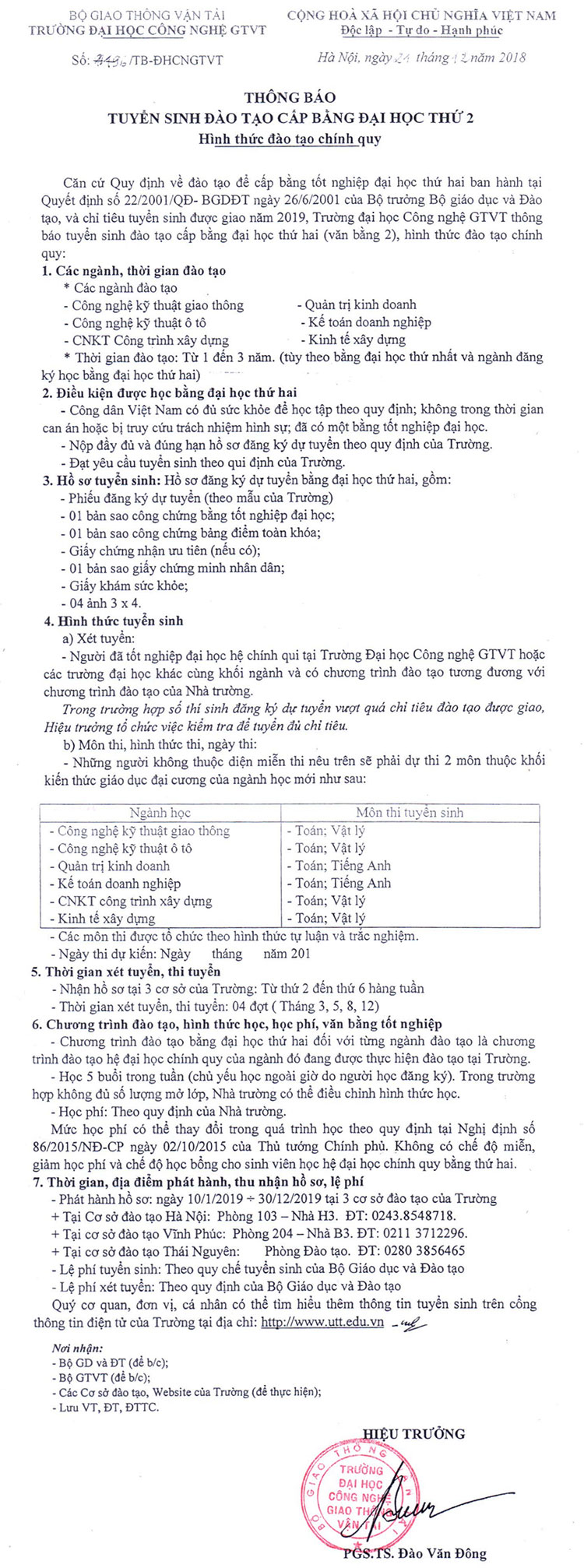 Thông báo Tuyển sinh Đào tạo Cấp bằng đại học thứ 2 (Hình thức đào tạo chính quy)