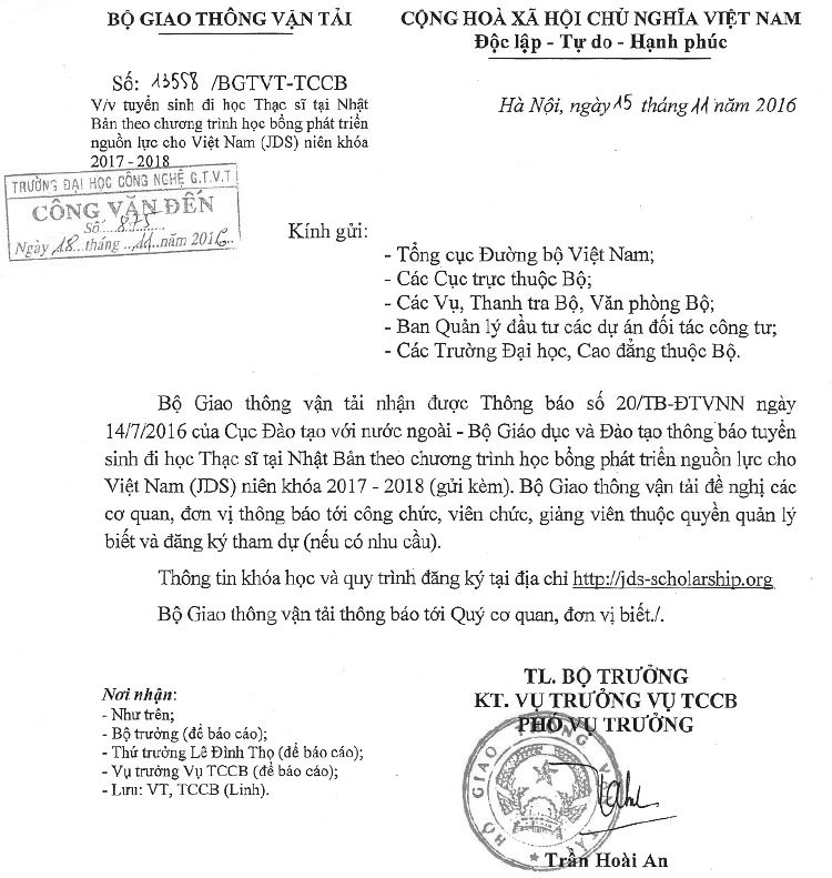Thông báo Tuyển sinh đi học Thạc sĩ tại Nhật Bản theo chương trình học bổng phát triển nguồn lực cho Việt Nam (JDS) niên khoá 2017 - 2018 21/11/2016 16:11