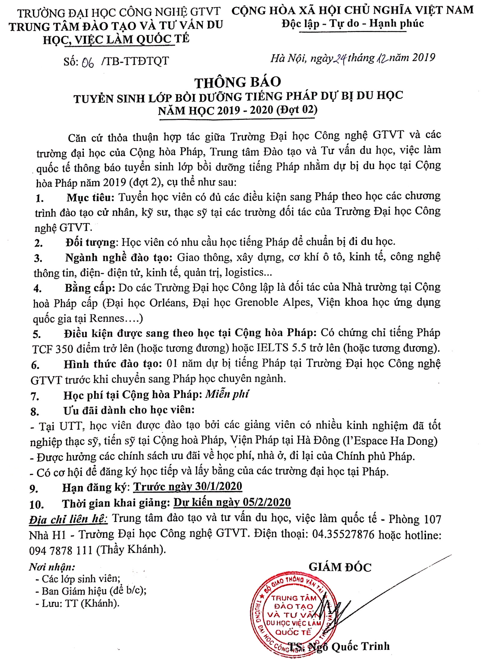 Thông báo Tuyển sinh lớp bồi dưỡng tiếng Pháp dự bị du học năm học 2019-2020 (Đợt 2) 24/12/2019 03:12