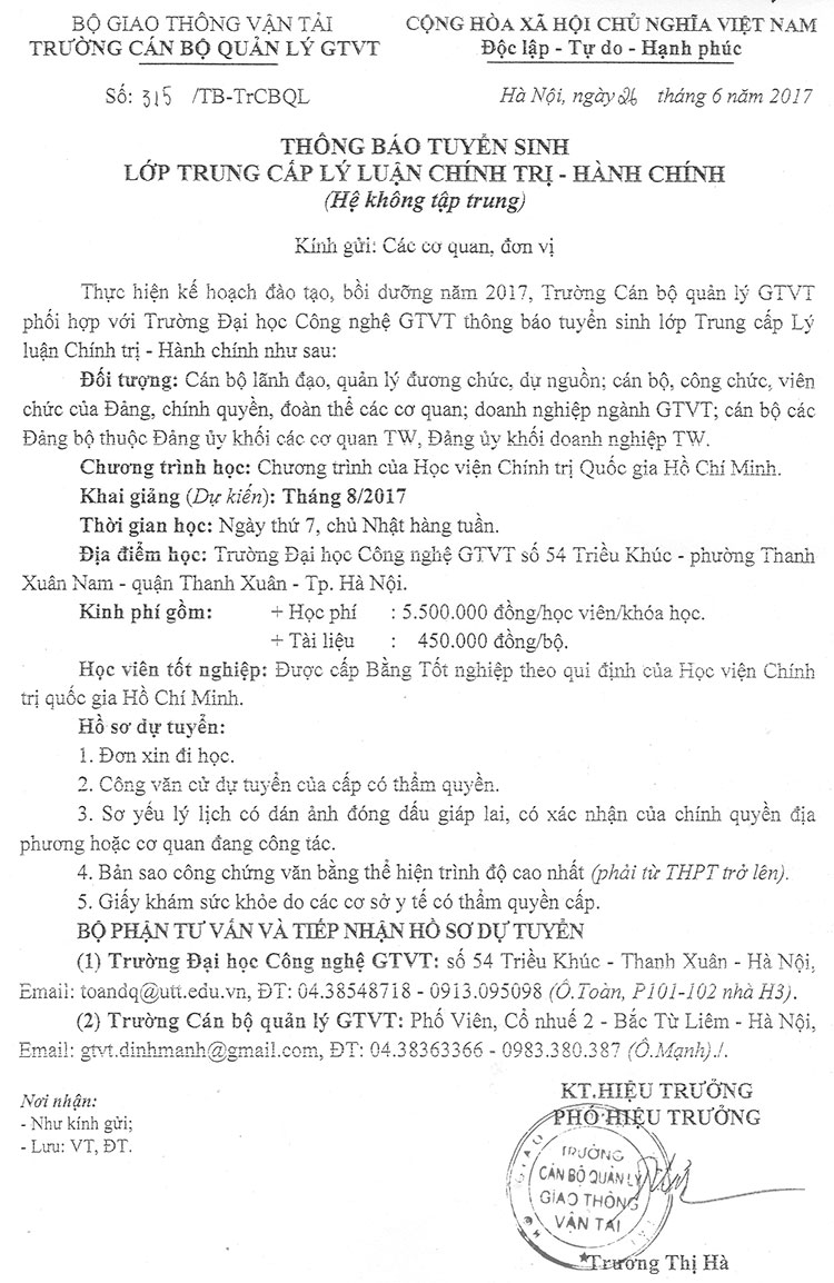 Thông báo Tuyển sinh lớp trung cấp lý luận chính trị - hành chính