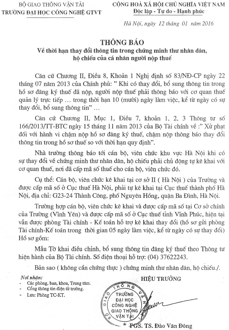 Thông báo về thời hạn thay đổi thông tin trong chứng minh thư nhân dân, hộ chiếu của cá nhân người nộp thuế 28/12/2016 09:12