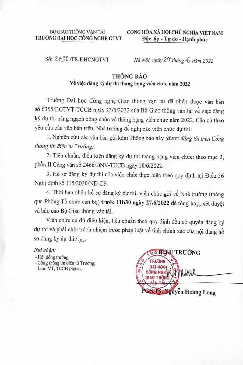 Thông báo về việc đăng ký dự thi thăng hạng viên chức năm 2022 24/06/2022 17:06 File đính kèm Thong-tu-so-77.2019--ap-dung-cho-vien-chuc-ke-toan-.doc Thong-tu-so-02.2021--ap-dung-cho-vien-chuc-hanh-chinh-.doc Cong-van-6355-cua-BGTVT.pdf Cong-van-2466-cua-BNV.pdf Thong-tu-so-40.2020-cua-BGD--T.doc Thong-tu-so-31.2021--ap-dung-vien-chuc-giang-day-.doc Nghi-dinh-115.2020-cua-chinh-phu.doc Tin liên quan Kế hoạch tổ chức Toạ đàm khoa học “Vai trò của Trí tuệ nhân tạo và công nghệ mới trong nâng cao hiệu quả nghiên cứu lĩnh vực tài chính kế toán” 24/10/2025 Thông báo về việc cử cán bộ tham gia khóa bồi dưỡng tại Học viện Ngoại giao 20/10/2025 Về việc lấy ý kiến góp ý vào dự thảo Quyết định ban hành Quy định về công tác thi đua, khen thưởng của Trường Đại học Công nghệ GTVT 09/10/2025 Thông báo về việc thống kê khối lượng hoạt động phục vụ cộng đồng của giảng viên năm học 2024-2025 02/10/2025 Kê khai khối lượng hoạt động khoa học và công nghệ phục vụ thanh toán khối lượng thừa giờ năm học 2024-2025 01/10/2025 Tổ chức lớp bồi dưỡng nghiệp vụ sư phạm và bồi dưỡng tiêu chuẩn chức danh nghề nghiệp giảng viên đại học 01/10/2025 Tin nổi bật UTT ra mắt Mạng lưới trung tâm đào tạo xuất sắc và tài năng trong lĩnh vực Công nghệ giao thông và Hạ tầng tiên... 10/10/2025 13:10 Thông tin mới nhất Người thầy lặng lẽ gieo hạt tri thức và lan tỏa giá trị khoa học Việt Nam 27/10/2025 10:10 Kế hoạch tổ chức Toạ đàm khoa học “Vai trò của Trí tuệ nhân tạo và công nghệ mới trong nâng cao hiệu quả nghiên... 24/10/2025 14:10 Thông báo về việc cử cán bộ tham gia khóa bồi dưỡng tại Học viện Ngoại giao 20/10/2025 15:10 Lễ ký kết hợp tác đào tạo Chương trình liên kết 2 + 2 giữa UTT và Trường Đại học Giao thông Quốc gia Hàn Quốc... 20/10/2025 10:10 Hội thảo Quốc tế về Đường sắt tốc độ cao ICHSR năm 2025 17/10/2025 14:10