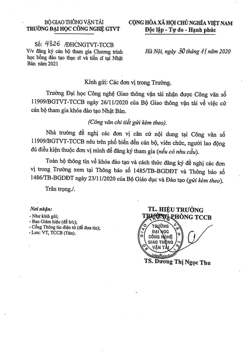 Thông báo về việc đăng ký tham gia chương trình học bổng đào tạo thạc sĩ và tiến sĩ tại Nhật Bản năm 2021 30/11/2020 09:11 File đính kèm BGTVT-TCCB-11909-1301--1-.pdf