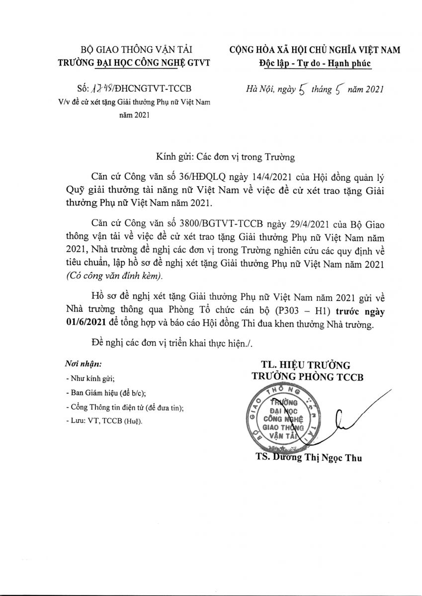 Thông báo về việc đề cử xét tặng Giải thưởng Phụ nữ Việt Nam 2021 06/05/2021 17:05 File đính kèm 1745-DHCNGTVT-TCCB.pdf