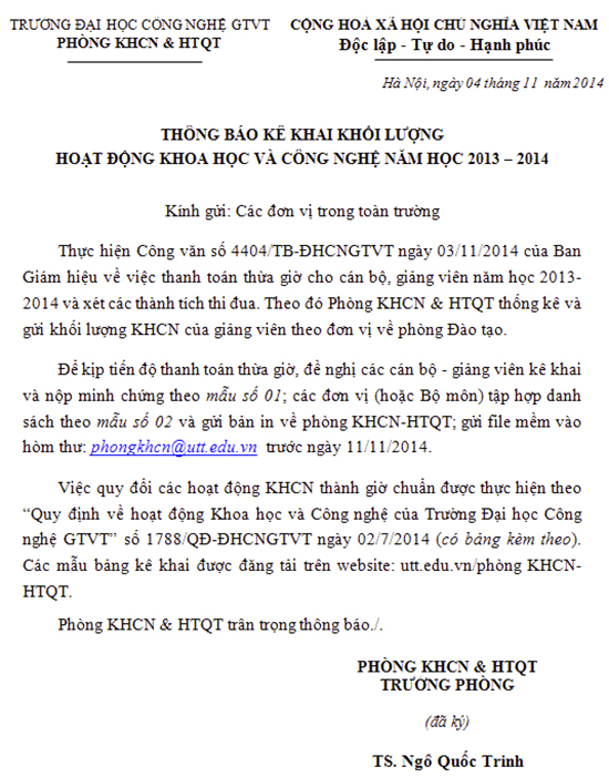 Thông báo về việc kê khai khối lượng KHCN năm học 2013-2014 06/11/2014 00:11 Attachments: Mau bang khoi luong KHCN.xls [Mẫu bảng khối lượng KHCN] 0 kB