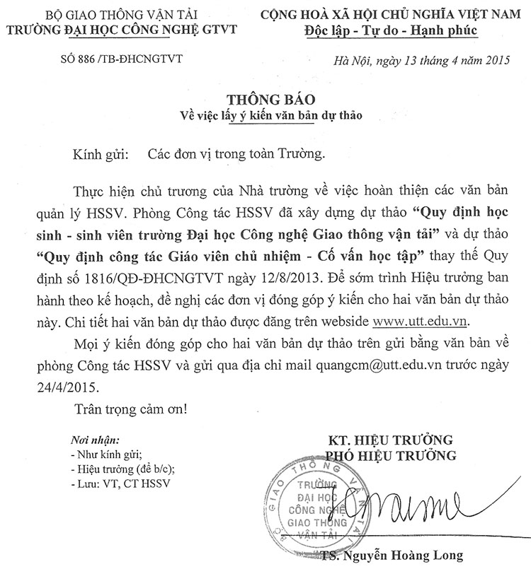 Thông báo về việc lấy ý kiến văn bản dự thảo 17/04/2015 00:04 Nội dung chi tiết của văn bản đề nghị xem tại tệp đính kèm./. Attachments: quy-che-hoc-sinh-sinh-vien-utt-du-thao.doc [ ] 279 kB quy-dinh-giao-vien-chu-nhiem-du-thao.doc [ ] 89 kB