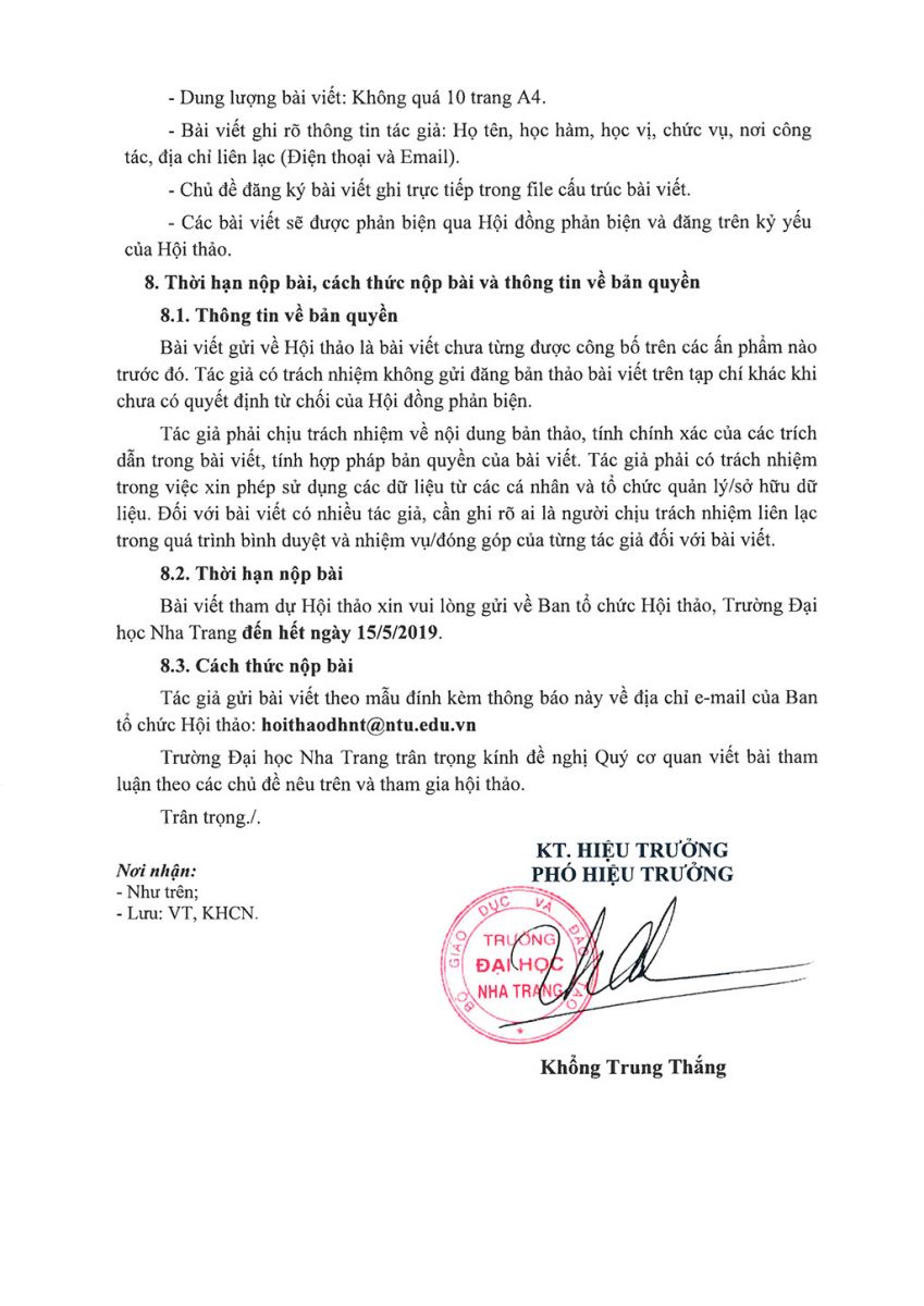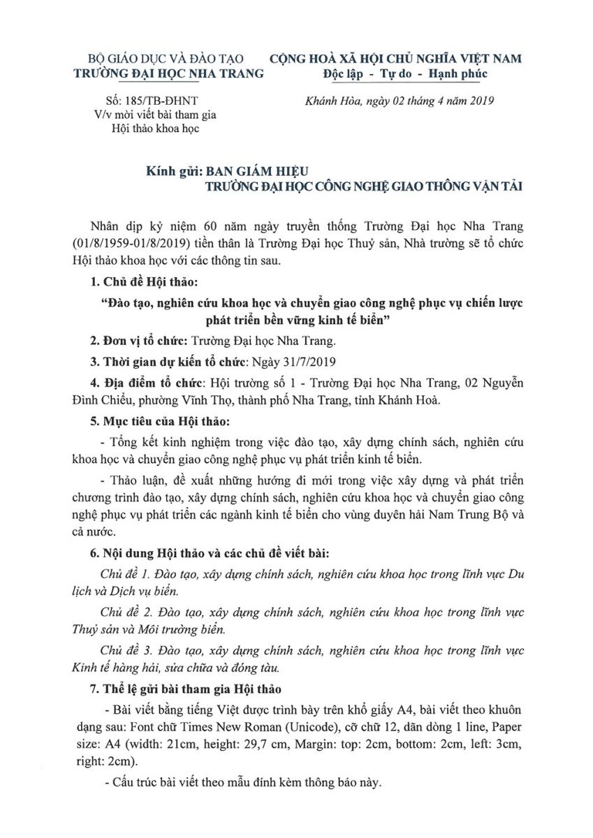 Thông báo về việc mời viết bài tham gia Hội thảo khoa học tại Đại học Nha Trang 10/04/2019 08:04 File đính kèm 20190405180413.pdf