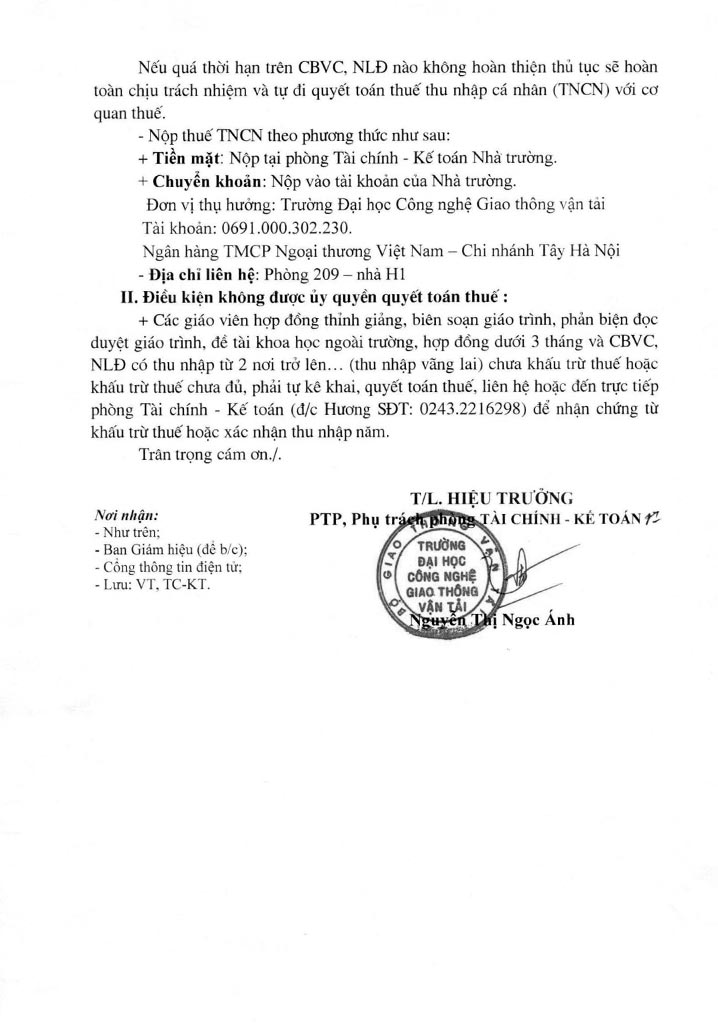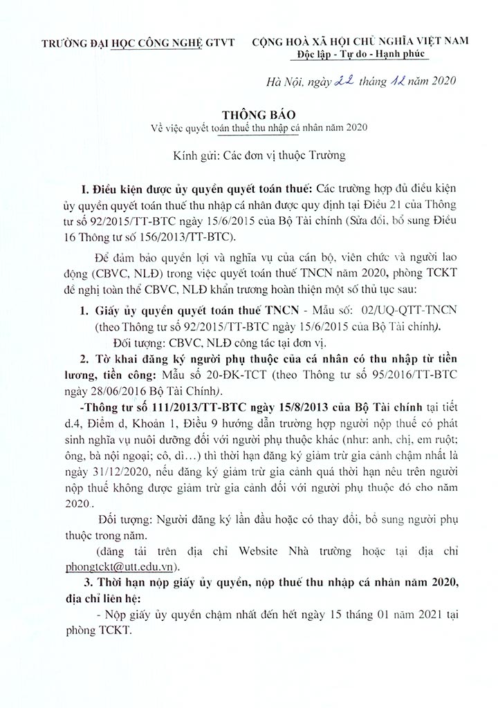 Thông báo về việc Quyết toán thuế thu nhập cá nhân năm 2020 25/12/2020 01:12 File đính kèm Mau-bieu-20-DK-TCT.docx mau-02uq-qtt-tncn.doc Tin liên quan Thông báo về việc cập nhật thông tin Căn cước công dân cho người phụ thuộc 30/10/2025 Kế hoạch tổ chức Toạ đàm khoa học “Vai trò của Trí tuệ nhân tạo và công nghệ mới trong nâng cao hiệu quả nghiên cứu lĩnh vực tài chính kế toán” 24/10/2025 Thông báo về việc cử cán bộ tham gia khóa bồi dưỡng tại Học viện Ngoại giao 20/10/2025 Về việc lấy ý kiến góp ý vào dự thảo Quyết định ban hành Quy định về công tác thi đua, khen thưởng của Trường Đại học Công nghệ GTVT 09/10/2025 Thông báo về việc thống kê khối lượng hoạt động phục vụ cộng đồng của giảng viên năm học 2024-2025 02/10/2025 Kê khai khối lượng hoạt động khoa học và công nghệ phục vụ thanh toán khối lượng thừa giờ năm học 2024-2025 01/10/2025
