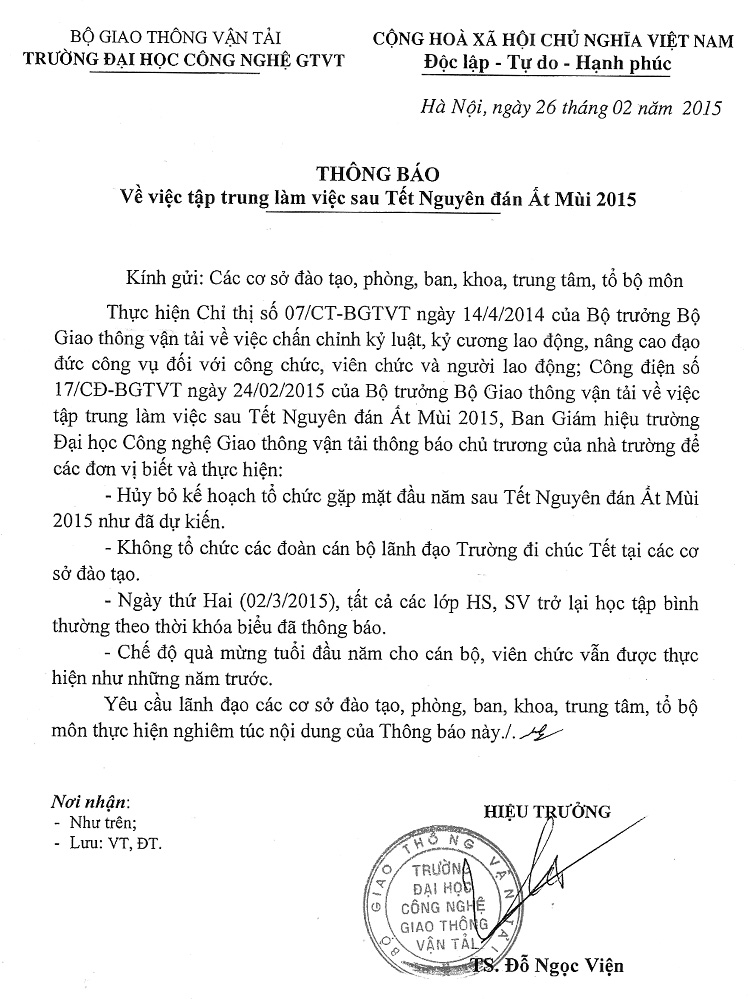 Thông báo về việc tập trung làm việc sau Tết nguyên đán Ất Mùi 2015