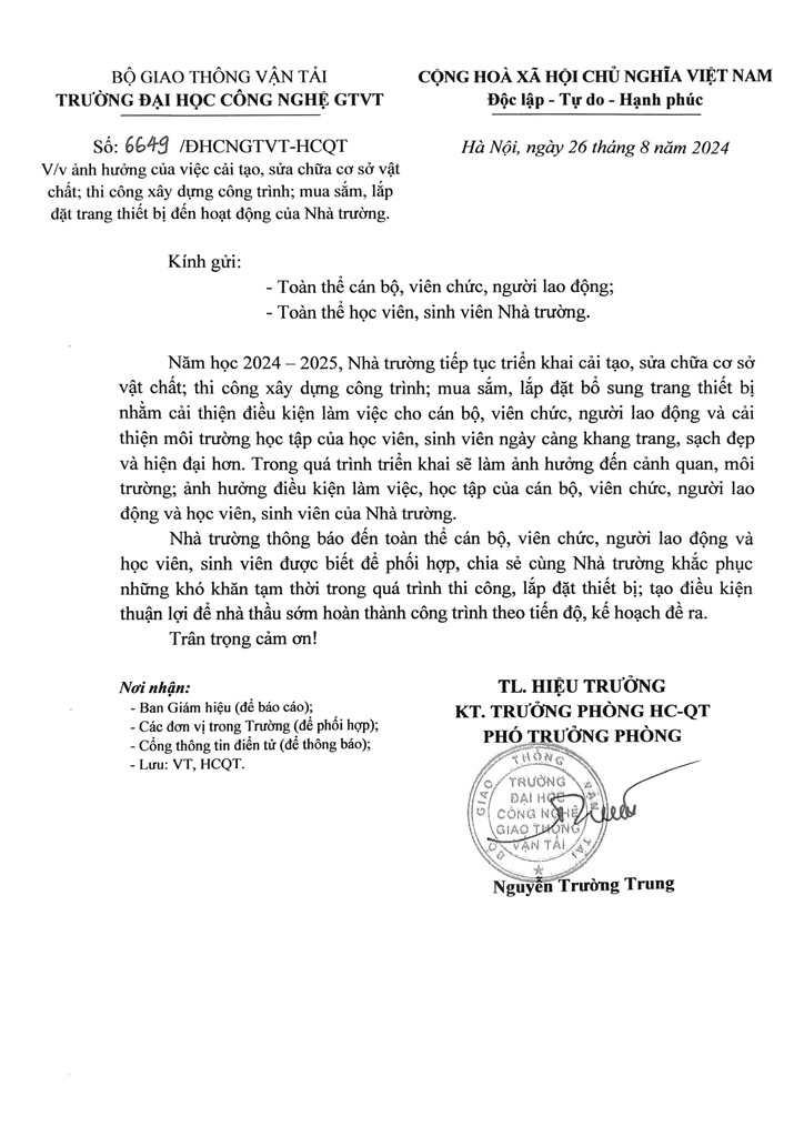 Thông báo về việc thi công xây dựng công trình tại Phân hiệu Hà Nội