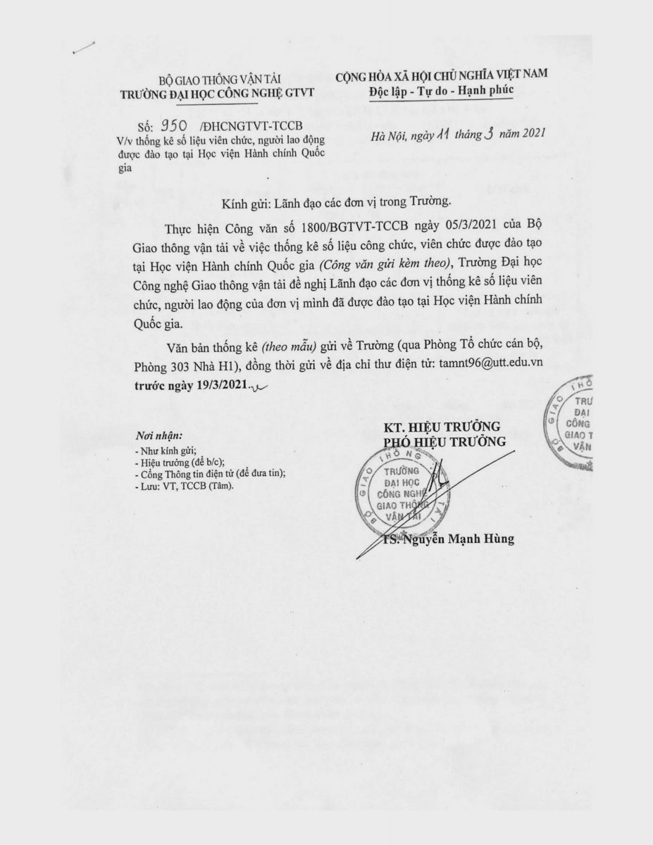 Thông báo về việc thống kê số liệu viên chức, người lao động được đào tạo tại Học viện Hành chính Quốc gia 15/03/2021 16:03 File đính kèm 950-DHCNGTVT-TCCB.pdf