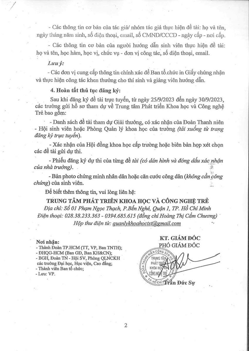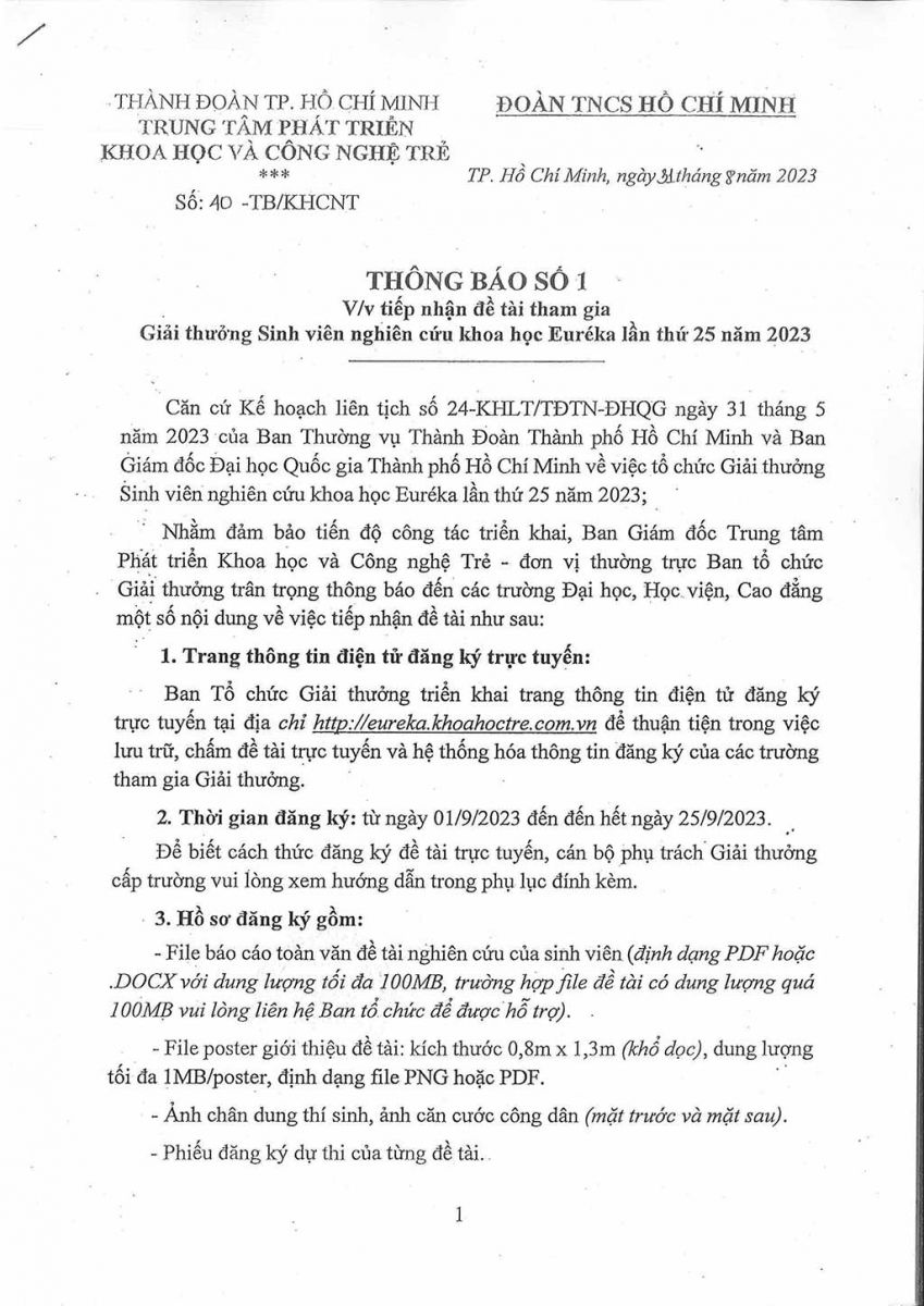 Thông báo về việc tiếp nhận đề tài tham gia Giải thưởng Sinh viên NCKH Euréka lần thứ 25 năm 2023
