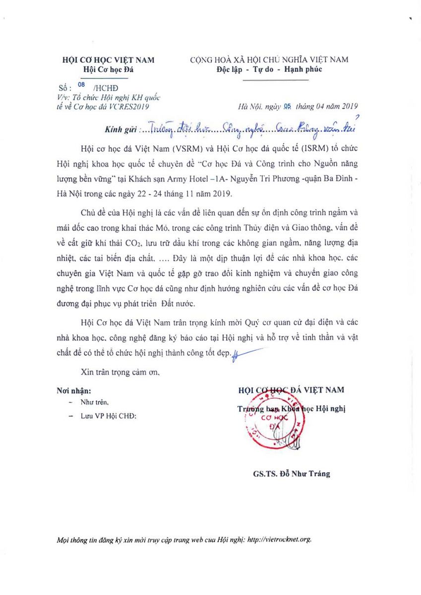 Thông báo về việc tổ chức Hội nghị khoa học quốc tế về Cơ học đá VCRES2019 19/04/2019 14:04 File đính kèm 20190419160902.pdf