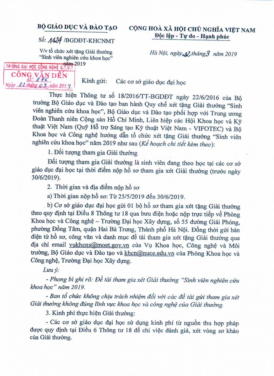 Thông báo về việc tổ chức xét tặng Giải thưởng Sinh viên nghiên cứu khoa học năm 2019 25/03/2019 15:03 File đính kèm Q---BGD--T-652-275.PDF