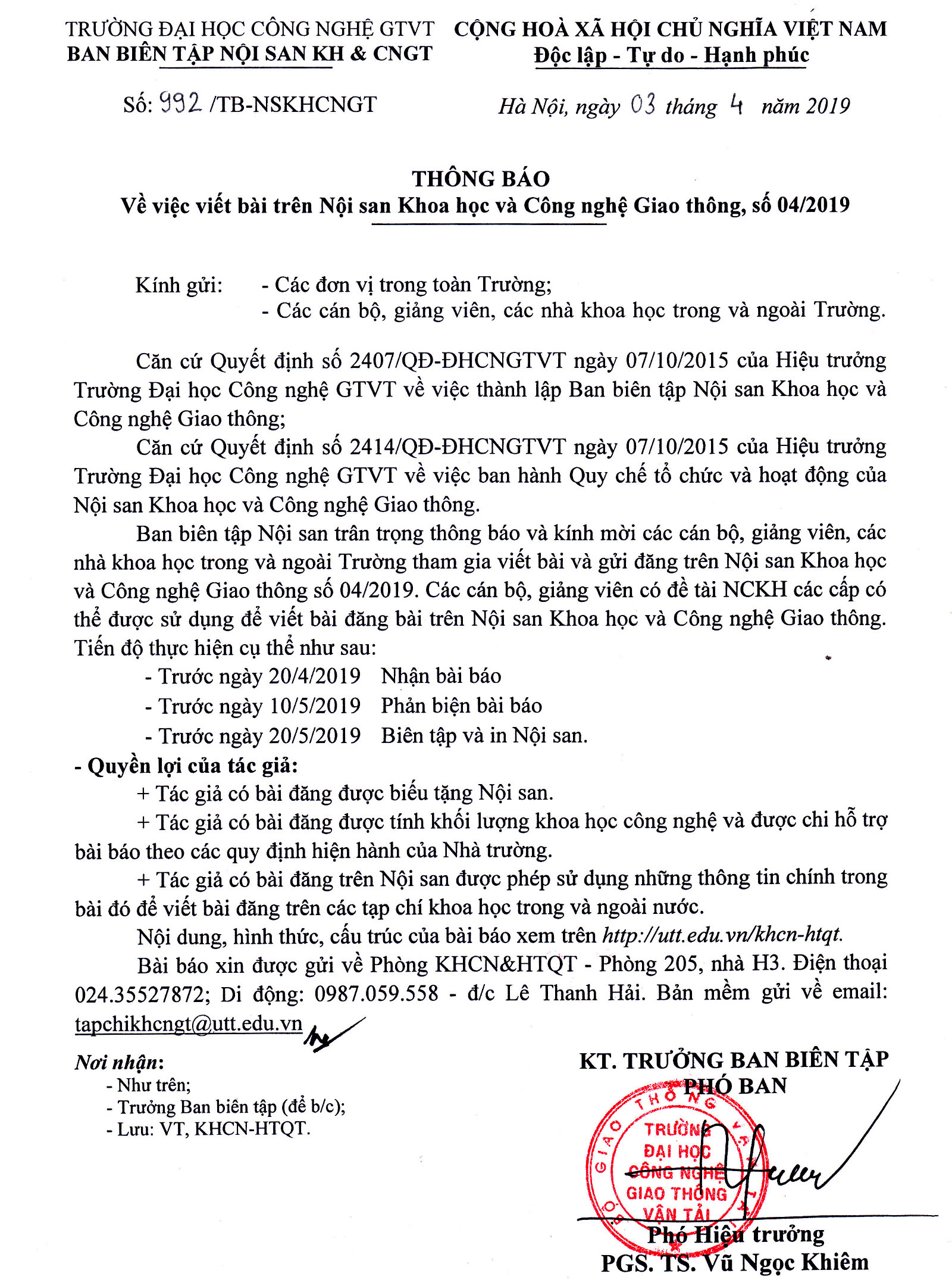 Thông báo viết bài trên Nội san Khoa học và Công nghệ Giao thông, số 04/2019