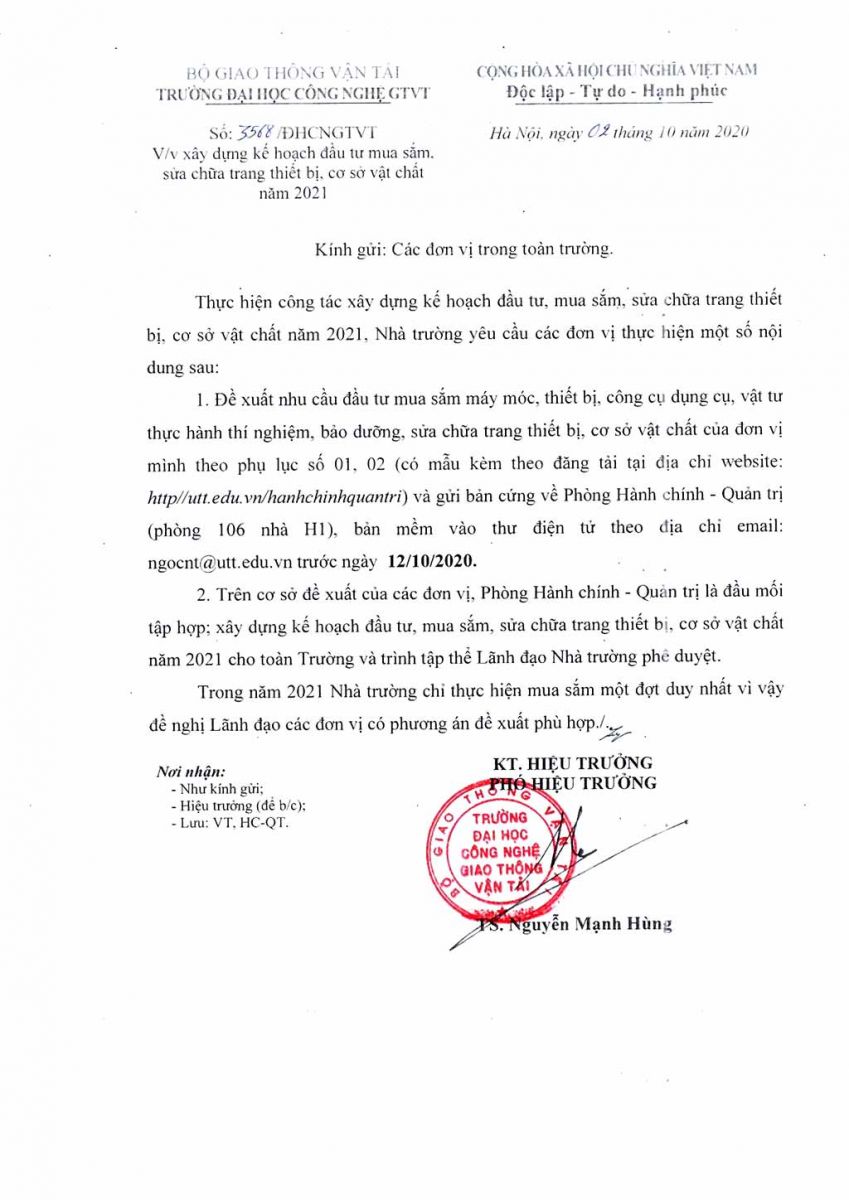 Thông báo xây dựng kế hoạch đầu tư mua sắm, sửa chữa trang thiết bị, cơ sở vật chất năm 2021 05/10/2020 03:10 File đính kèm Bieu-mau-thong-ke-mua-sam-2021.doc