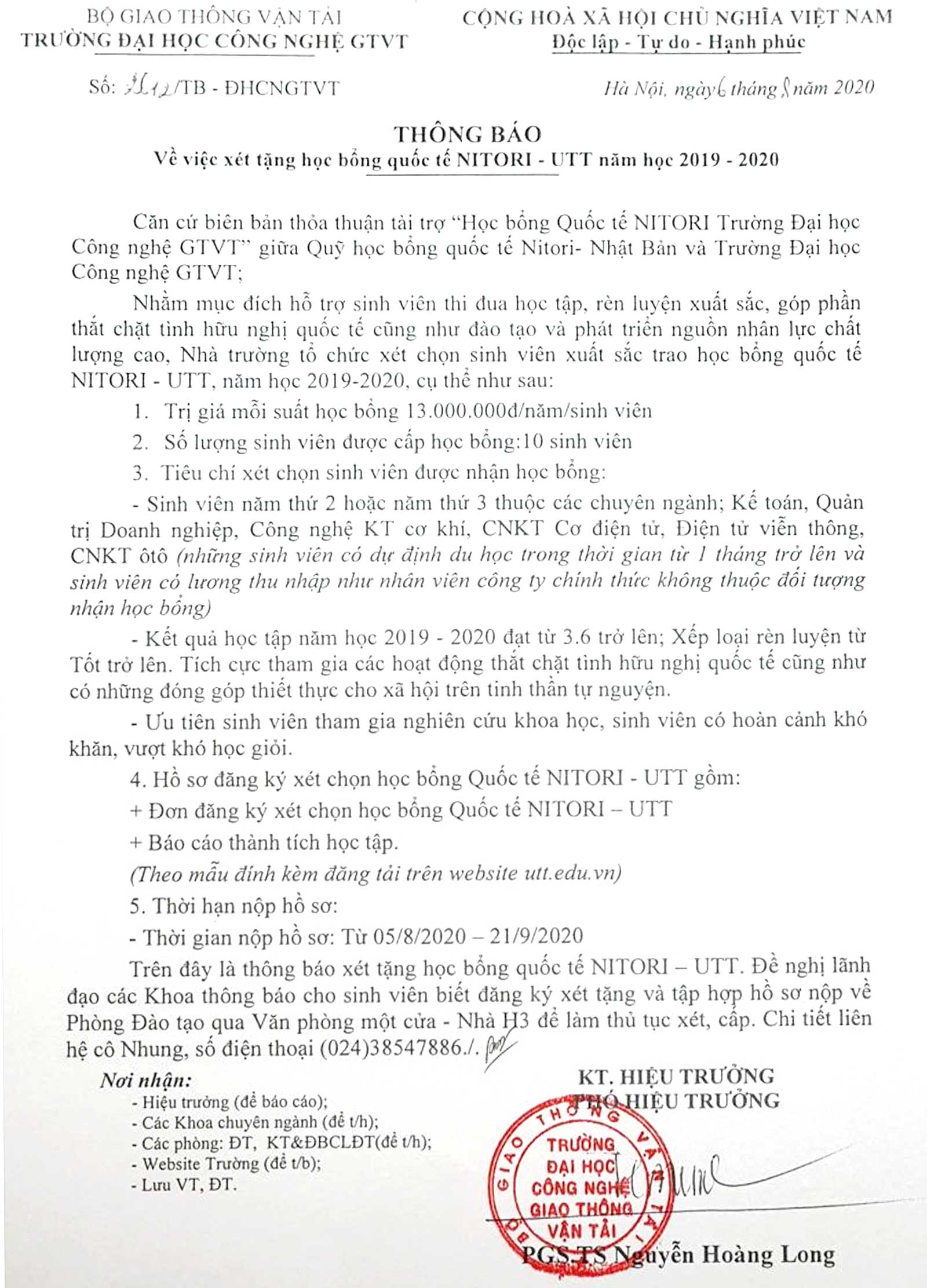 Thông báo xét tặng học bổng quốc tế NITORI - UTT năm học 2019 - 2020 07/08/2020 02:08 File đính kèm 03.-Eng_Nitori-Scholarship-Application-Form.xlsx 02.-Nitori-Scholarship-Foundation-Student-report.doc Tin liên quan Thông báo về việc cập nhật thông tin Căn cước công dân cho người phụ thuộc 30/10/2025 Kế hoạch tổ chức Toạ đàm khoa học “Vai trò của Trí tuệ nhân tạo và công nghệ mới trong nâng cao hiệu quả nghiên cứu lĩnh vực tài chính kế toán” 24/10/2025 Thông báo về việc cử cán bộ tham gia khóa bồi dưỡng tại Học viện Ngoại giao 20/10/2025 Về việc lấy ý kiến góp ý vào dự thảo Quyết định ban hành Quy định về công tác thi đua, khen thưởng của Trường Đại học Công nghệ GTVT 09/10/2025 Thông báo về việc thống kê khối lượng hoạt động phục vụ cộng đồng của giảng viên năm học 2024-2025 02/10/2025 Kê khai khối lượng hoạt động khoa học và công nghệ phục vụ thanh toán khối lượng thừa giờ năm học 2024-2025 01/10/2025