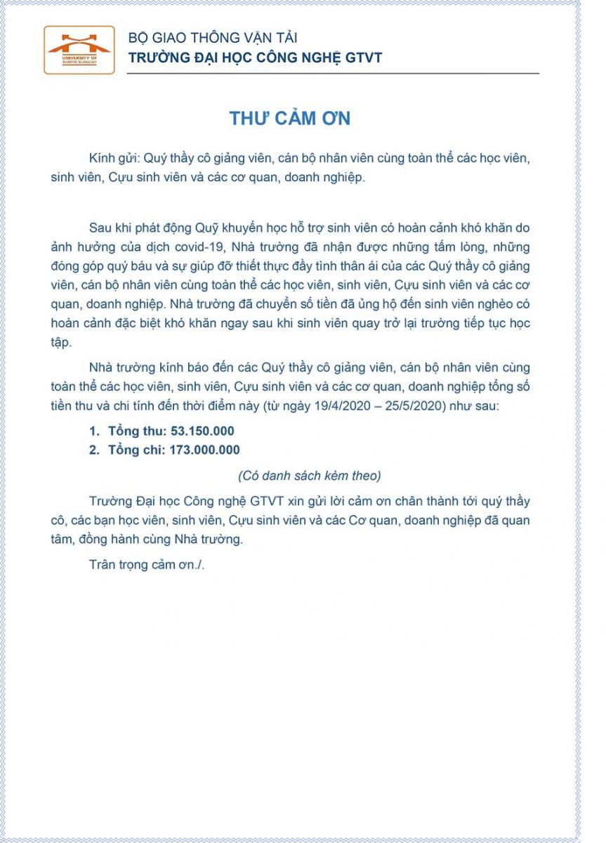 Thư cảm ơn ủng hộ Quỹ khuyến học dành cho sinh viên bị ảnh hưởng bởi dịch Covid-19 03/06/2020 16:06 File đính kèm TONG-HOP-QUY-KHUYEN-H---C--COVID-19-2020.xlsx