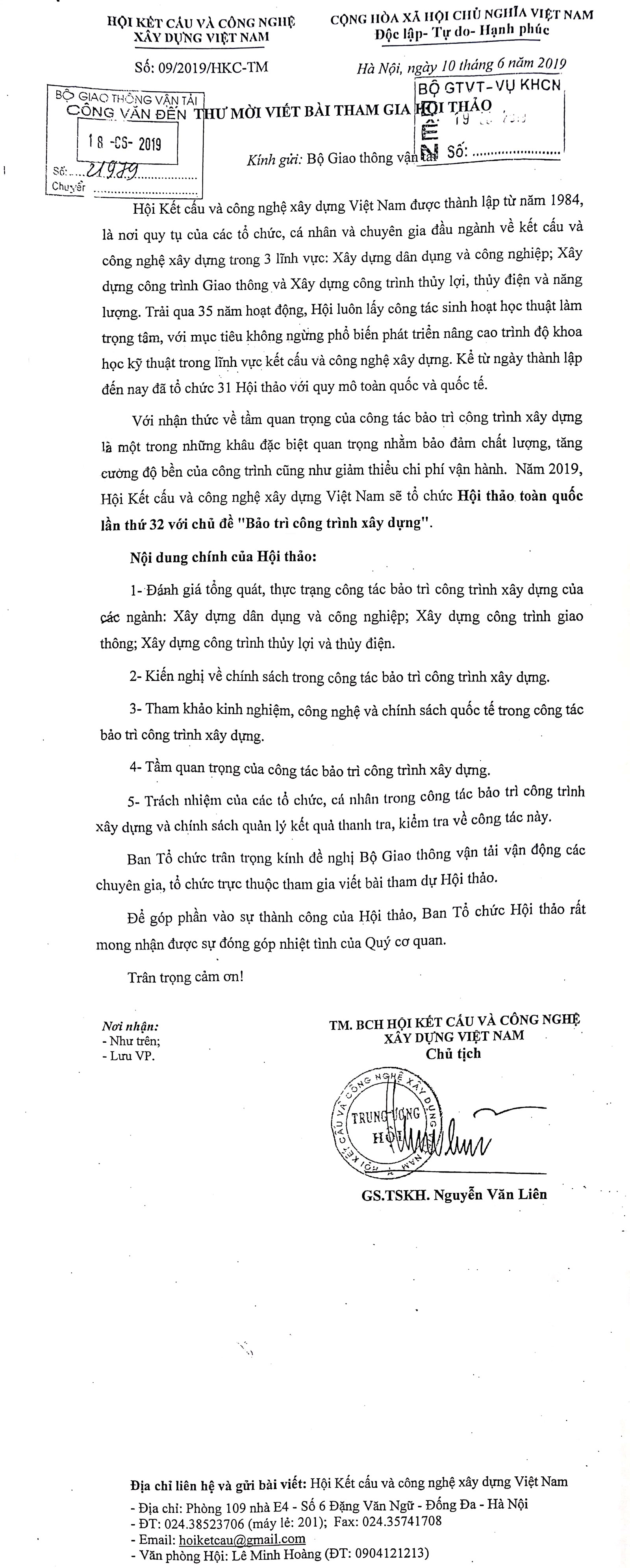 Thư mời Tham gia Hội thảo toàn quốc lần thứ 32 với chủ đề Bào trì công trình xây dựng 12/07/2019 17:07