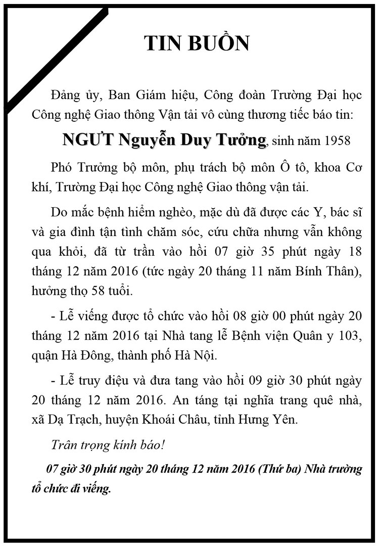 Tin buồn Nhà giáo ưu tú Nguyễn Duy Tưởng