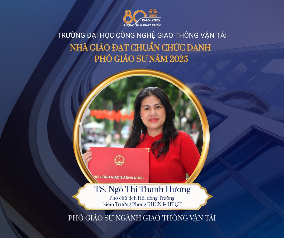 Trong lĩnh vực Giao thông vận tải, TS. Ngô Thị Thanh Hương được công nhận đạt chuẩn Phó Giáo sư chuyên ngành Nền móng công trình. Cô bảo vệ thành công luận án Tiến sĩ tại Học viện Kỹ thuật Quân sự và có gần 25 năm công tác tại UTT, hiện giữ chức Phó Chủ tịch Hội đồng Trường, kiêm Trưởng phòng Khoa học Công nghệ và Hợp tác Quốc tế. Cô đã triển khai nhiều nghiên cứu về nền móng công trình, địa kỹ thuật và các giải pháp cải thiện nền đất trong xây dựng hạ tầng giao thông, đồng thời tham gia nhiều chương trình hợp tác quốc tế quan trọng, góp phần nâng cao năng lực nghiên cứu và hội nhập của Nhà trường.