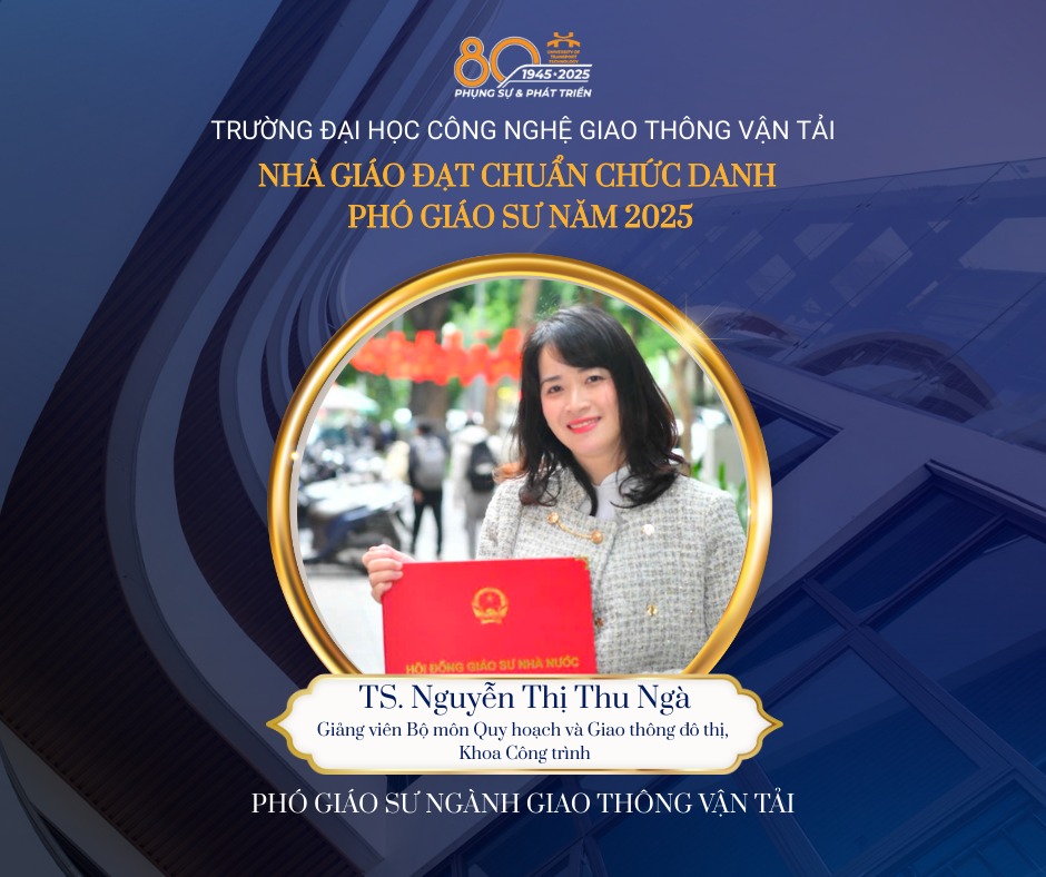 Cũng thuộc ngành Giao thông vận tải, TS. Nguyễn Thị Thu Ngà được công nhận đạt chuẩn chức danh Phó Giáo sư chuyên ngành Vật liệu. Cô hoàn thành quá trình đào tạo đại học – cao học – nghiên cứu sinh tại Trường Đại học GTVT và công tác tại UTT từ năm 2014. Là giảng viên Bộ môn Quy hoạch và Giao thông đô thị, Khoa Công trình, cô hướng nghiên cứu vào vật liệu giao thông, vật liệu bền vững và kết cấu hạ tầng giao thông đô thị. Cô có nhiều công bố khoa học và đóng góp trong đào tạo, nghiên cứu và phát triển các giải pháp vật liệu tiên tiến phục vụ xây dựng hạ tầng giao thông hiện đại.