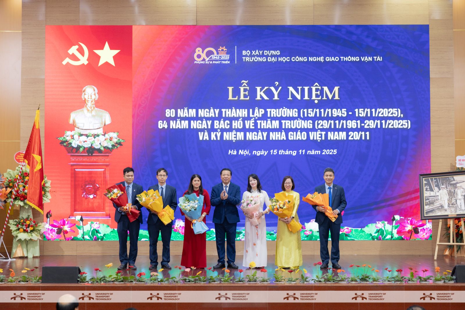 Bộ trưởng Bộ Xây dựng Trần Hồng Minh tặng hoa chúc mừng 06 nhà giáo Trường Đại học Công nghệ GTVT được công nhận đạt chuẩn Phó Giáo sư năm 2025
