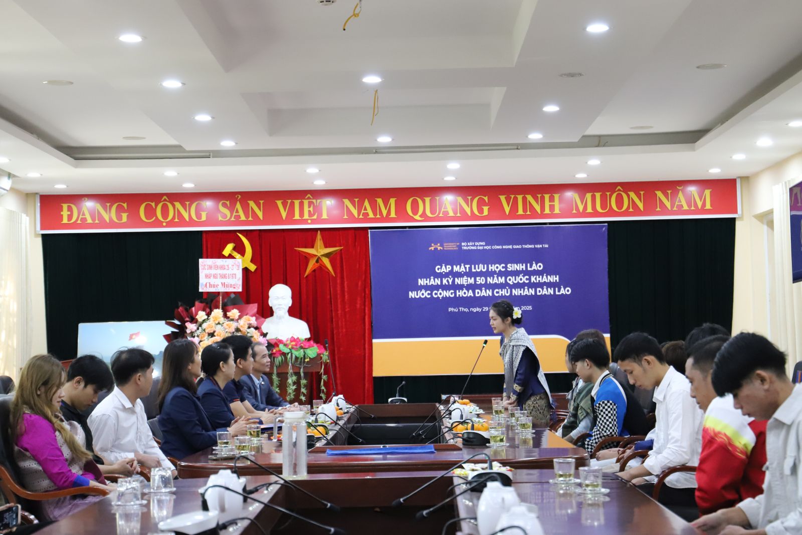 Ngày 29/11/2025, tại Phòng họp tầng 3 – Cơ sở đào tạo Phú Thọ, Trường Đại học Công nghệ Giao thông vận tải (UTT) trang trọng tổ chức buổi gặp mặt lưu học sinh Lào nhân dịp kỷ niệm 50 năm Quốc khánh Lào (2/12/1975 – 2/12/2025). Sự kiện không chỉ mang ý nghĩa tri ân lịch sử mà còn thể hiện tình cảm, trách nhiệm và sự đồng hành của Nhà trường đối với cộng đồng lưu học sinh quốc tế, đặc biệt là lưu học sinh Lào.