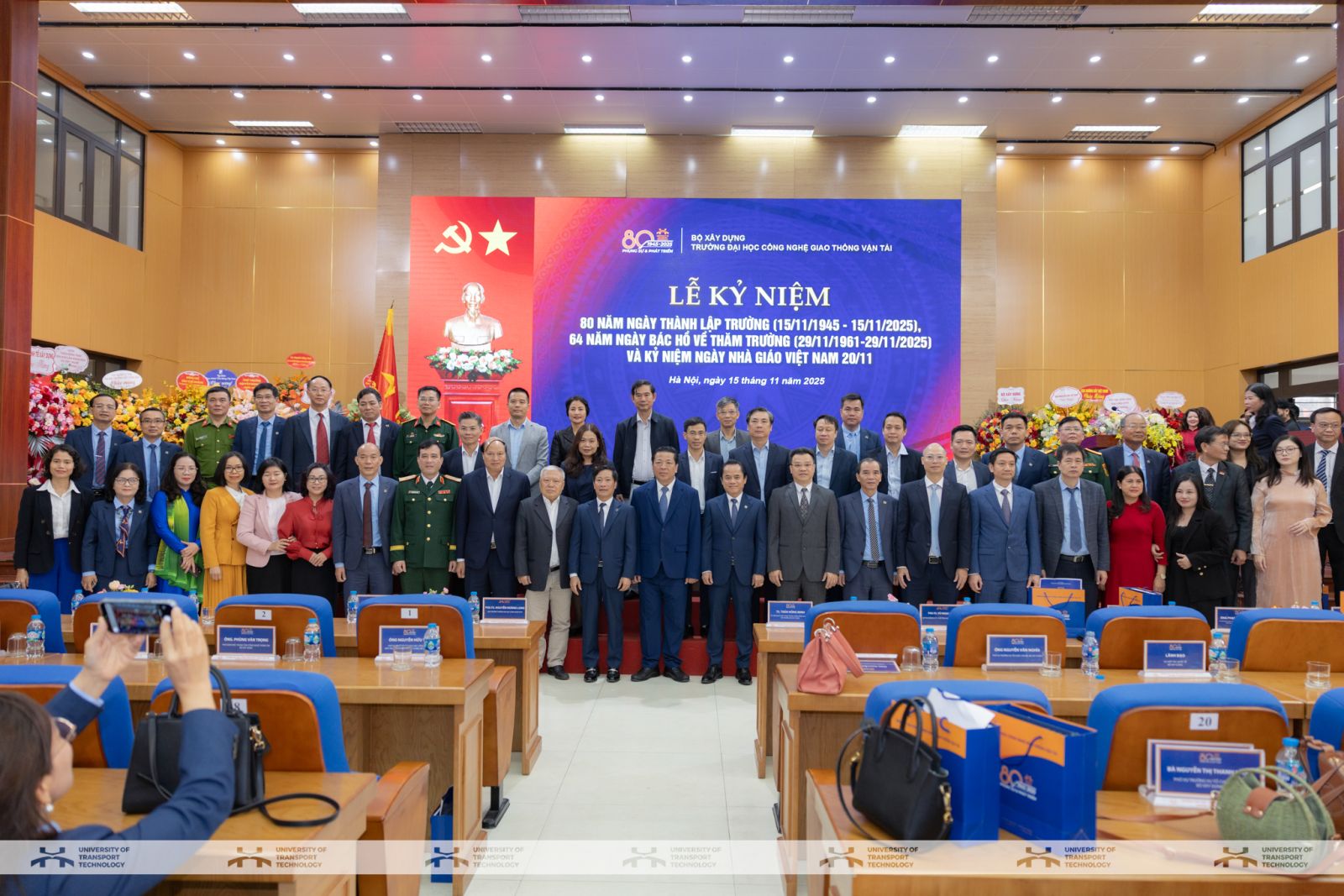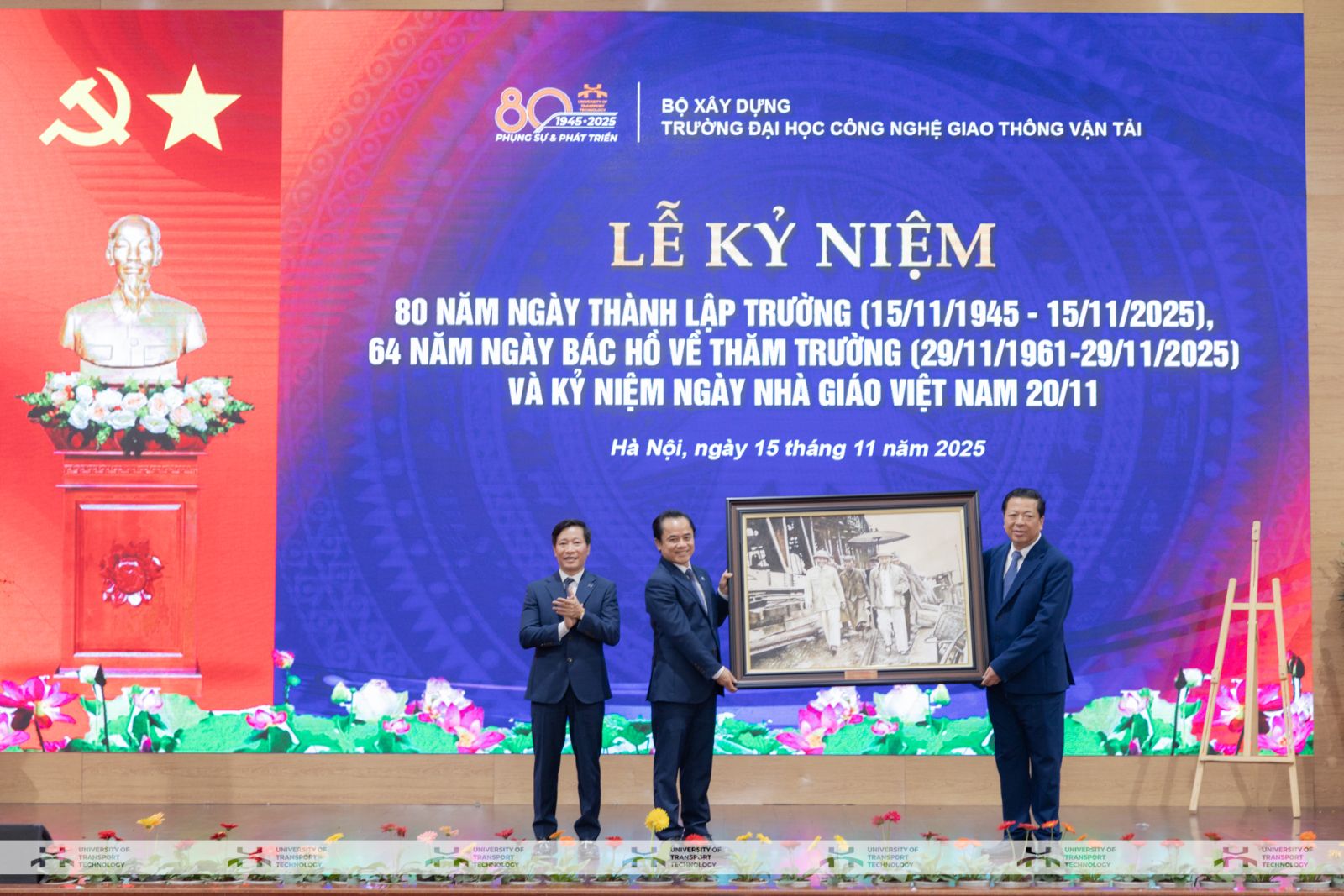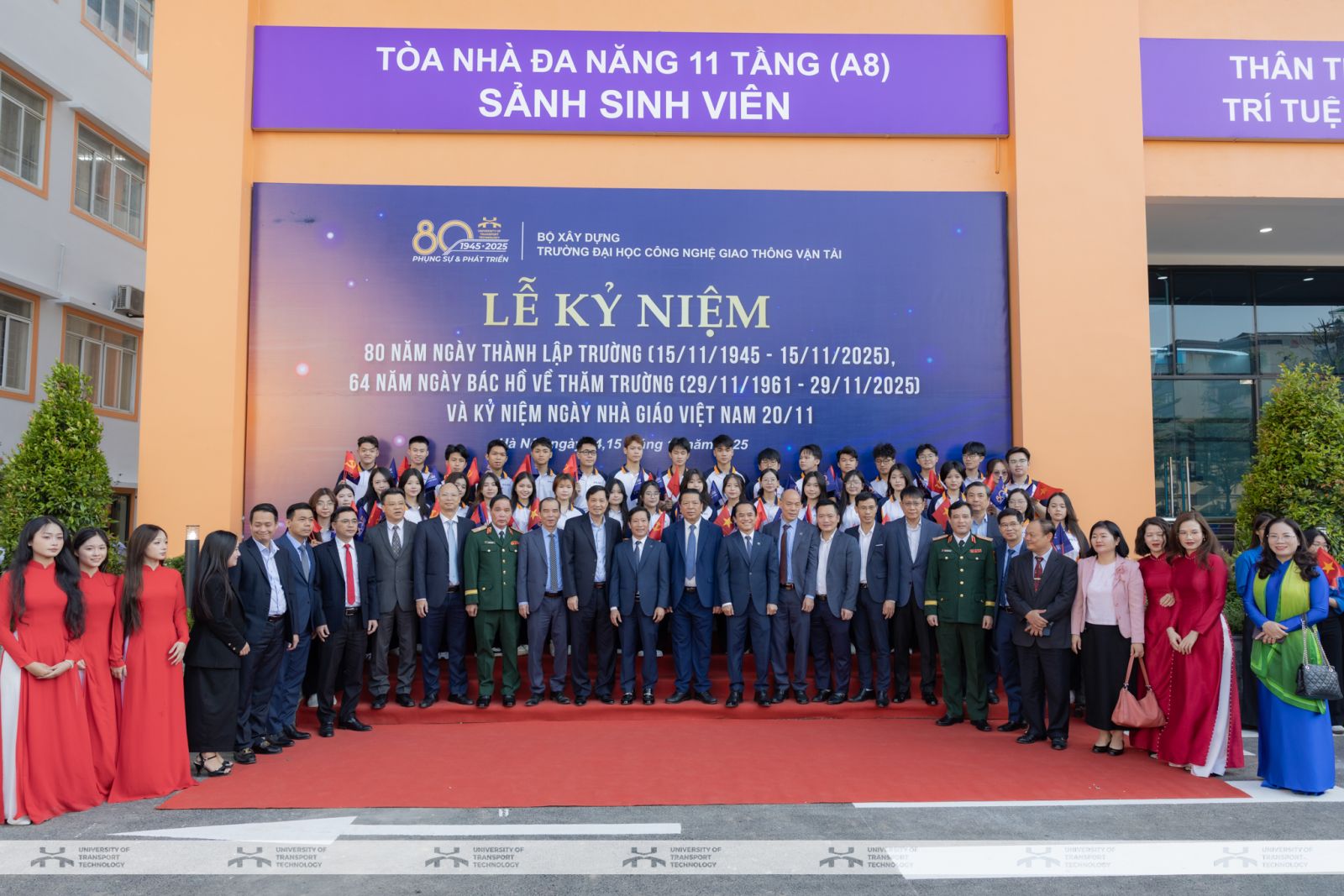 Sáng ngày 15/11/2025, tại Hà Nội, Trường Đại học Công nghệ GTVT (UTT) đã long trọng tổ chức Lễ kỷ niệm 80 năm thành lập Trường (15/11/1945-15/11/2025), 64 năm ngày Bác Hồ về thăm Trường (29/11/1961-29/11/2025) và chào mừng ngày Nhà giáo Việt Nam 20/11. Sự kiện diễn ra trong thời điểm toàn ngành Giáo dục và Đào tạo, khoa học - công nghệ và đổi mới sáng tạo được Đảng, Nhà nước xác định là trụ cột phát triển quốc gia, càng làm nổi bật ý nghĩa đặc biệt của lễ kỷ niệm đối với Trường và với ngành Giao thông - Xây dựng.