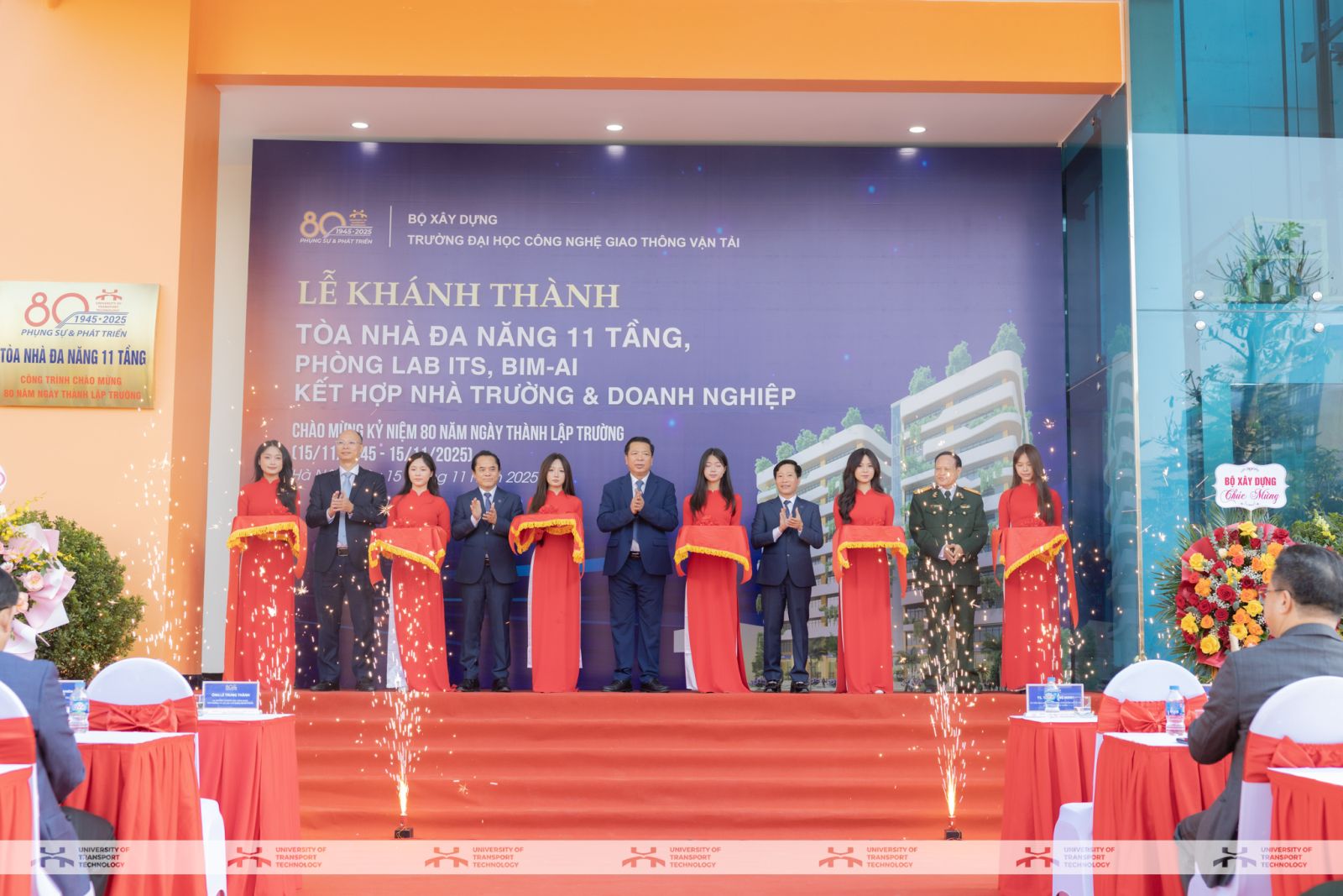 Trước khi diễn ra Lễ kỷ niệm, Bộ trưởng Trần Hồng Minh cùng các đại biểu tham dự đã thực hiện nghi thức cắt băng khánh thành Tòa nhà đa năng 11 tầng, Phòng Lab ITS và Phòng Lab BIM-AI; đồng thời thực hiện nghi thức trồng cây và tham quan khuôn viên Nhà trường trong không khí trang trọng và thân tình. Đây là những công trình trọng điểm được đầu tư nhằm hiện thực hóa tinh thần Nghị quyết 57 về đột phá khoa học - công nghệ - đổi mới sáng tạo và Nghị quyết 71 về đột phá giáo dục - đào tạo của Bộ Chính trị, tạo nền tảng hạ tầng hiện đại cho đào tạo STEM, nghiên cứu ứng dụng, chuyển giao công nghệ số và phát triển nguồn nhân lực chất lượng cao trong lĩnh vực giao thông - xây dựng.