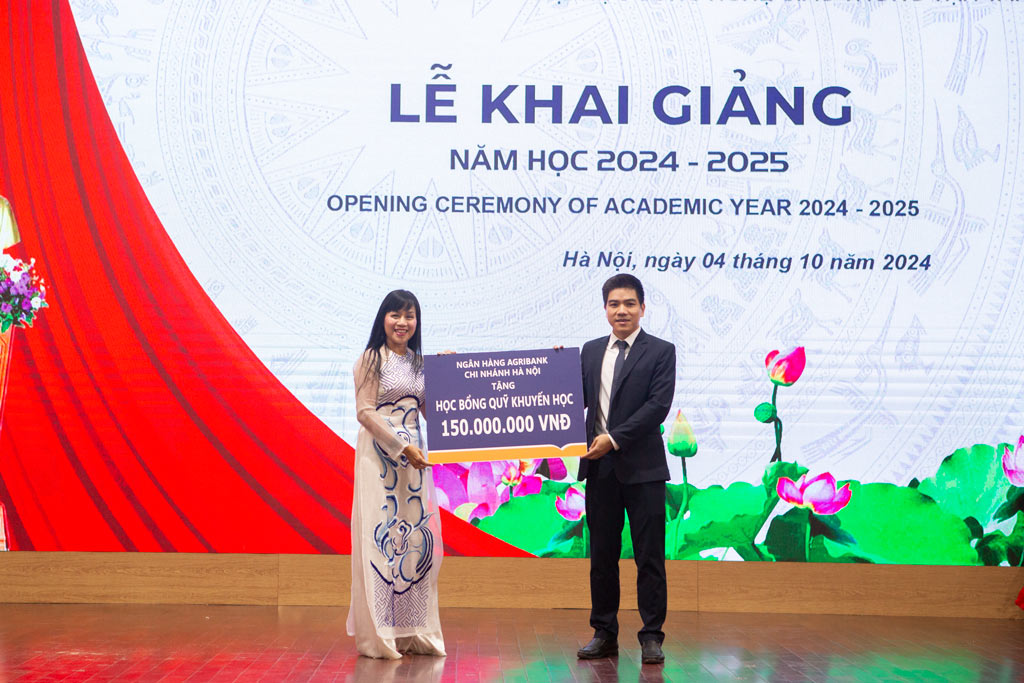 Cùng đồng hành với Nhà trường trong việc hỗ trợ khuyến khích các em sinh viên có hoàn cảnh khó khăn, phấn đấu vươn lên trong học tập, tại buổi Lễ, đại diện lãnh đạo các doanh nghiệp trao tặng học bổng vào Quỹ khuyến học của Nhà trường.