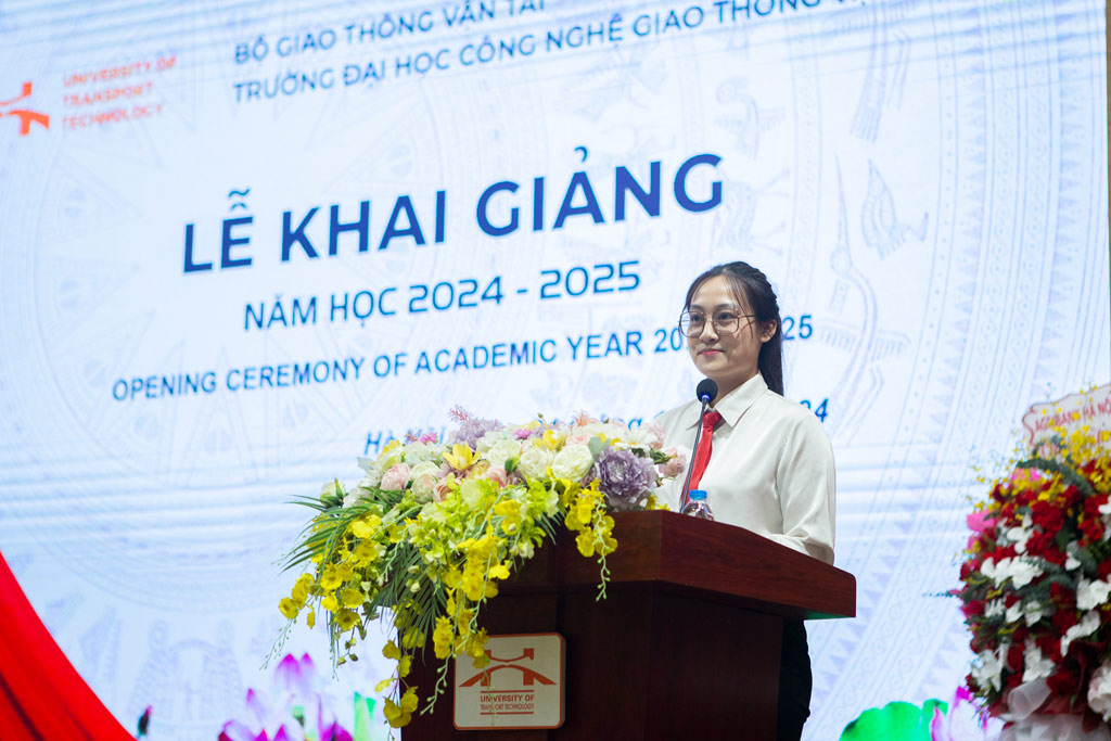 Đại diện cho tân sinh viên K75 của trường Đại học Công nghệ GTVT, em Lê Thị Thùy Chi, lớp 75DCQT22 Khoa Quản trị phát biểu cảm tưởng nhân dịp đầu năm học mới.