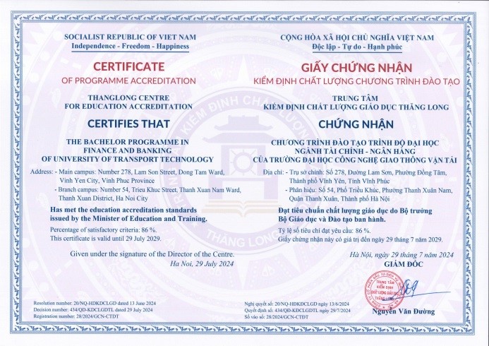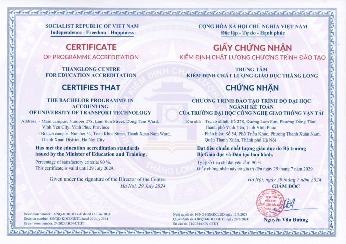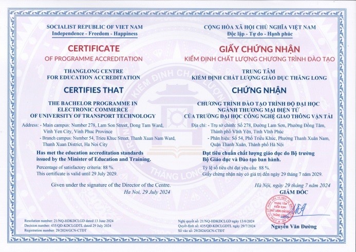 Ngày 29/7/2024, Trường Đại học Công nghệ Giao thông vận tải đón nhận Quyết định công nhận đạt tiêu chuẩn chất lượng và Giấy chứng nhận kiểm định chất lượng giáo dục của 11 chương trình đào tạo trình độ đại học, gồm các ngành: Công nghệ kỹ thuật cơ điện tử, Công nghệ kỹ thuật điện tử - viễn thông, Công nghệ kỹ thuật cơ khí, Công nghệ kỹ thuật công trình xây dựng, Công nghệ kỹ thuật môi trường, Kế toán, Kinh tế xây dựng, Khai thác vận tải, Logistics và Quản lý chuỗi cung ứng, Tài chính - Ngân hàng, Thương mại điện tử.