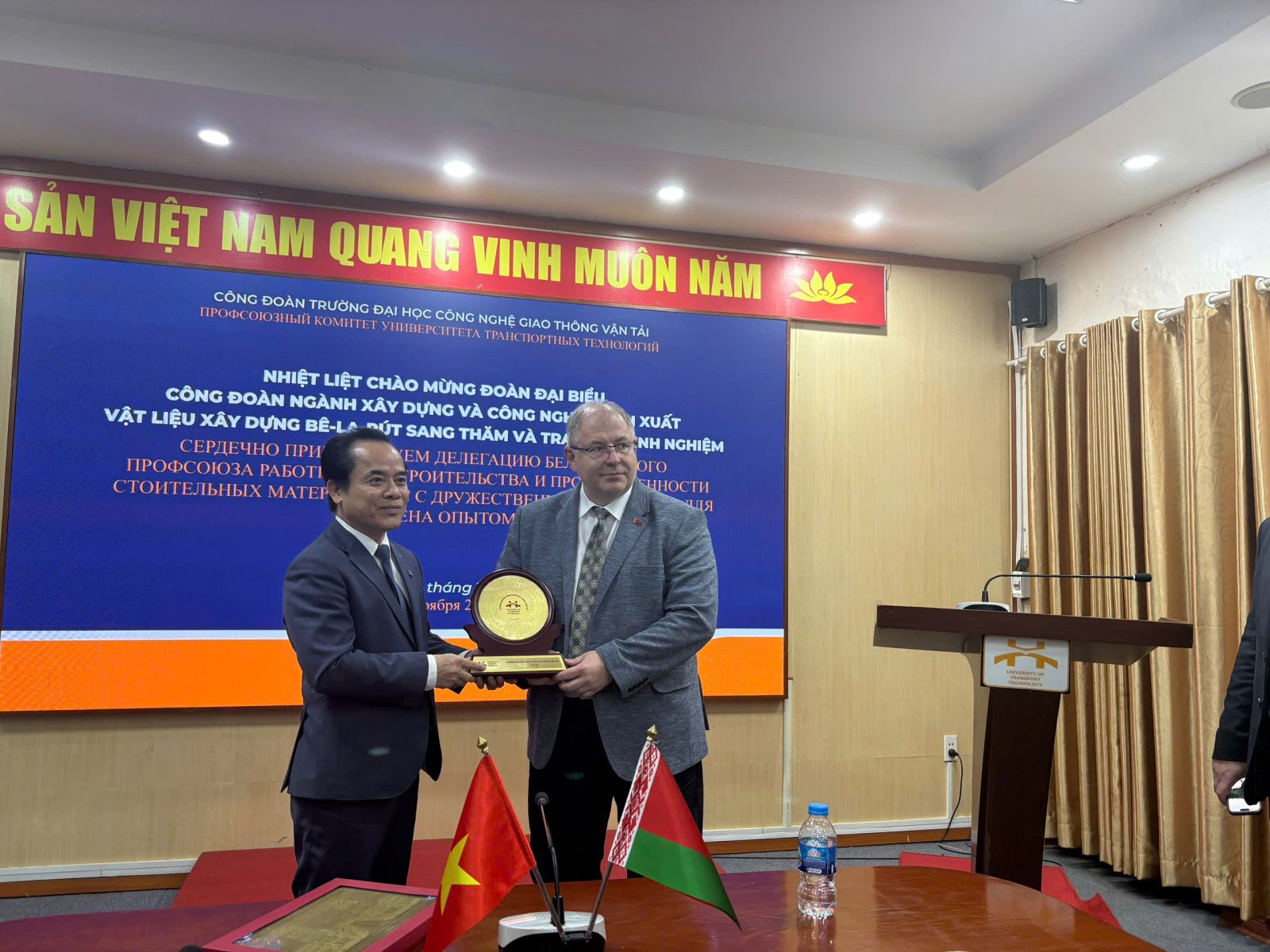 Chiều ngày 14/11/2025, Trường Đại học Công nghệ Giao thông vận tải (UTT) đã có buổi tiếp và làm việc với Đoàn đại biểu Công đoàn Ngành Xây dựng và Công nghiệp sản xuất vật liệu xây dựng Belarus trong khuôn khổ chuyến thăm, trao đổi kinh nghiệm tại Việt Nam. Chương trình do Công đoàn Trường Đại học Công nghệ GTVT chủ trì, diễn ra trong không khí thân tình, cởi mở và mang ý nghĩa tăng cường kết nối, hợp tác giữa các tổ chức công đoàn hai nước.