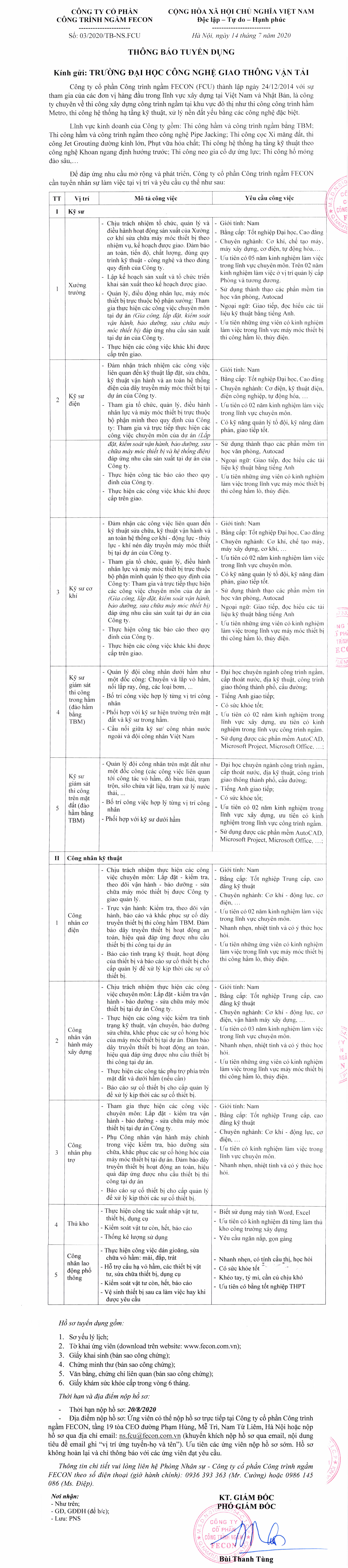 Công ty Cổ phần Công trình ngầm FECON tuyển nhân sự 15/07/2020 16:07 File đính kèm FECON_THONG-TIN-TUYEN-DUNG-THANG-8.2020.pdf