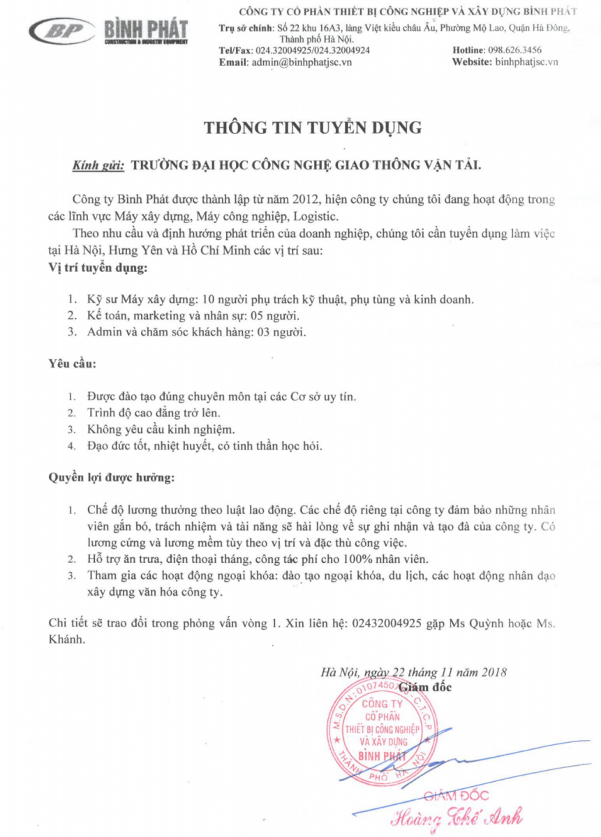 Công ty CP Thiết bị công nghiệp và xây dựng Bình Phát tuyển dụng Kỹ sư Máy xây dựng, Kế toán 25/11/2018 09:11