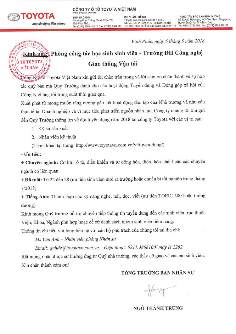 Công ty ô tô Toyota Việt Nam thông báo tuyển dụng kỹ sư sản xuất và nhân viên kỹ thuật 08/06/2018 11:06