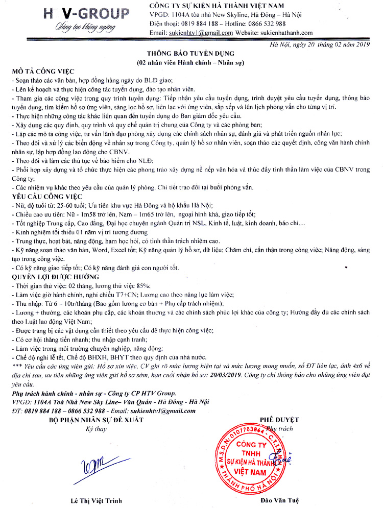 Công ty Sự kiện Hà Thành Việt Nam tuyển dụng nhân viên Hành chính - Nhân sự