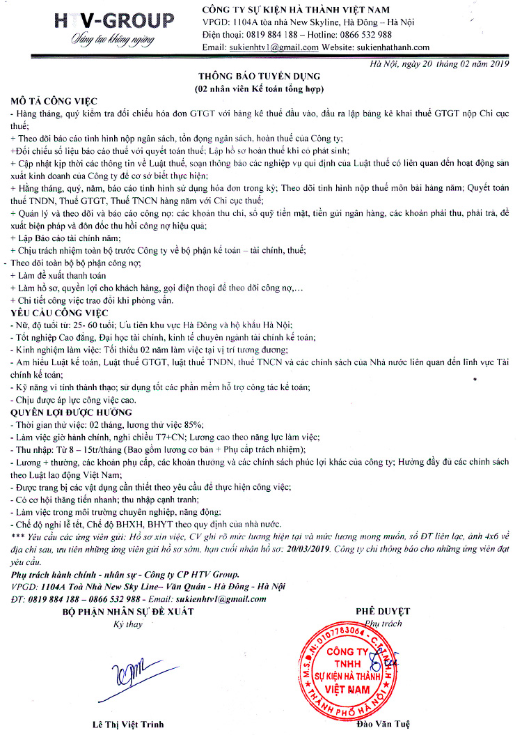 Công ty Sự kiện Hà Thành Việt Nam tuyển dụng nhân viên Kế toán tổng hợp