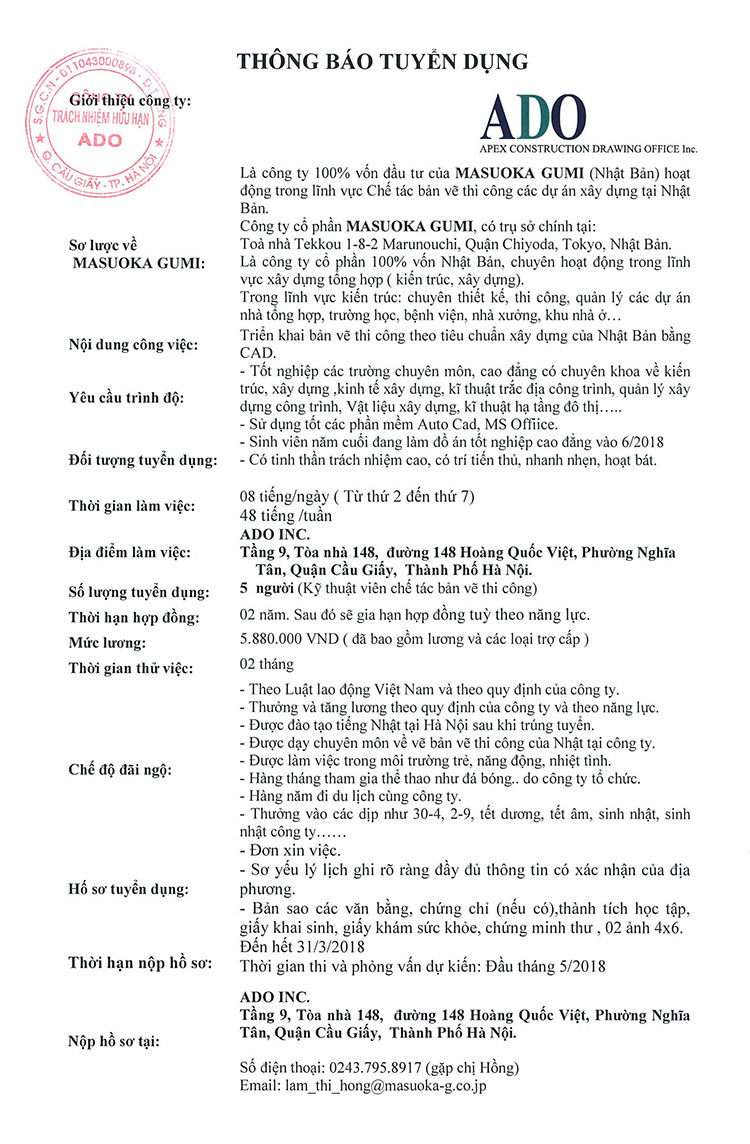Thông tin tuyển dụng kỹ sư, kỹ thuật viên công ty DAIZO TEC CO., LTD