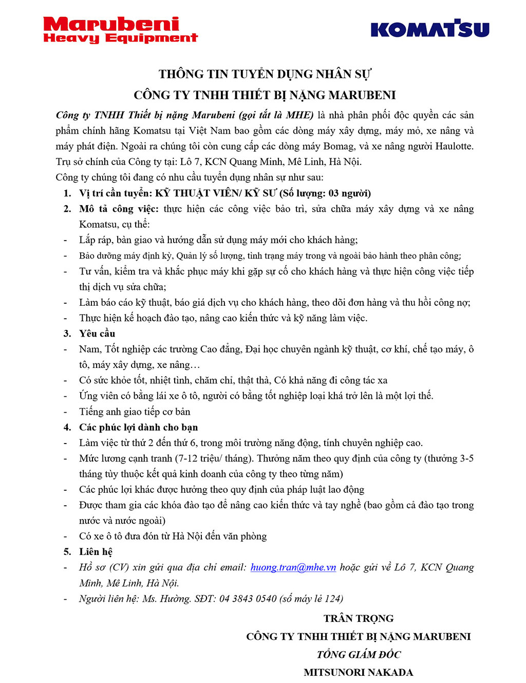 Công ty TNHH Thiết bị nặng Marubeni tuyển dụng kỹ sư Máy xây dựng 2019