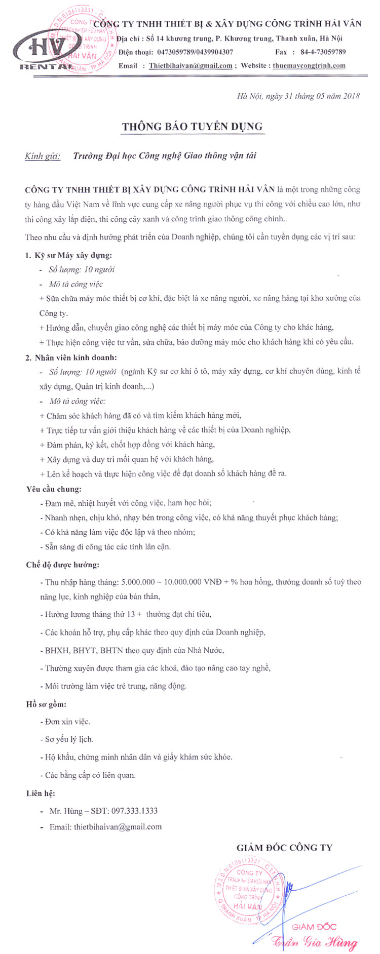 Công ty TNHH Thiết bị xây dựng công trình Hải Vân thông báo tuyển dụng