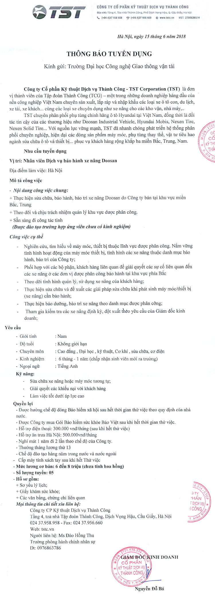 Công ty TNHH Tuyết Nga tuyển dụng Kỹ sư sửa chữa thiết bị nâng