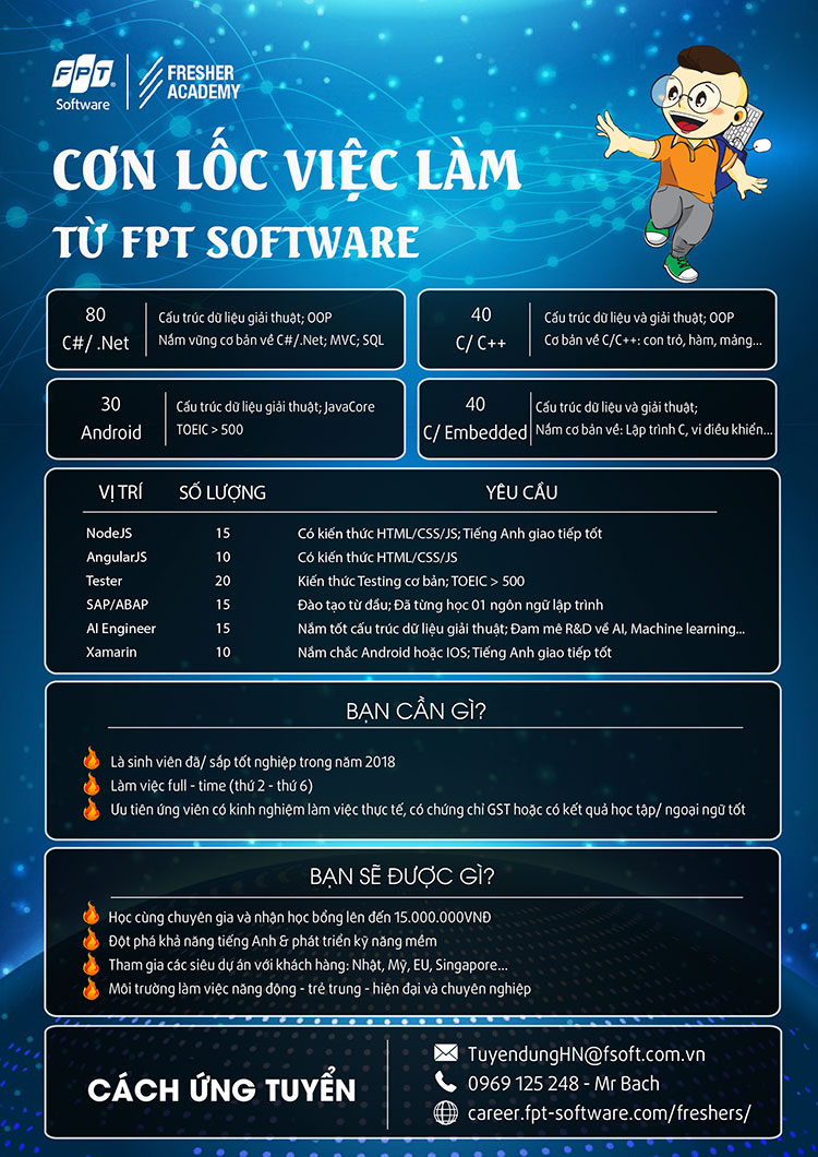 FPT Software - Cơn lốc việc làm 2018 20/08/2018 10:08 File đính kèm Ha-Noi_JD_Trainer_-Net_Fresher-Academy.doc FPT-Software_2018.docx Tin liên quan Công ty TNHH Dịch vụ Công nghệ VietStandard tuyển dụng 17/01/2024 Công ty Daizo Tec tuyển dụng tháng 4 năm 2023 03/04/2023 Tổng công ty viễn thông Mobifone thông báo tuyển nhân sự 15/02/2023 Công ty cổ phần MC-BiFi Bauchemie tuyển dụng thực tập sinh có hưởng lương 17/08/2022 Thông tin tuyển dụng kỹ sư, kỹ thuật viên công ty DAIZO TEC CO., LTD 06/04/2022 Công ty TNHH Tuyết Nga tuyển dụng Kỹ sư sửa chữa thiết bị nâng 24/11/2021