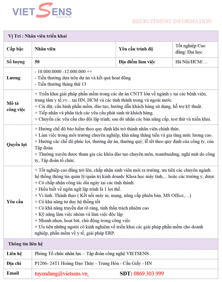 Tập đoàn công nghệ VIETSENS tuyển dụng nhân viên triển khai CNTT 15/06/2017 14:06 File đính kèm VietSens_JD_NV-trien-khai.doc