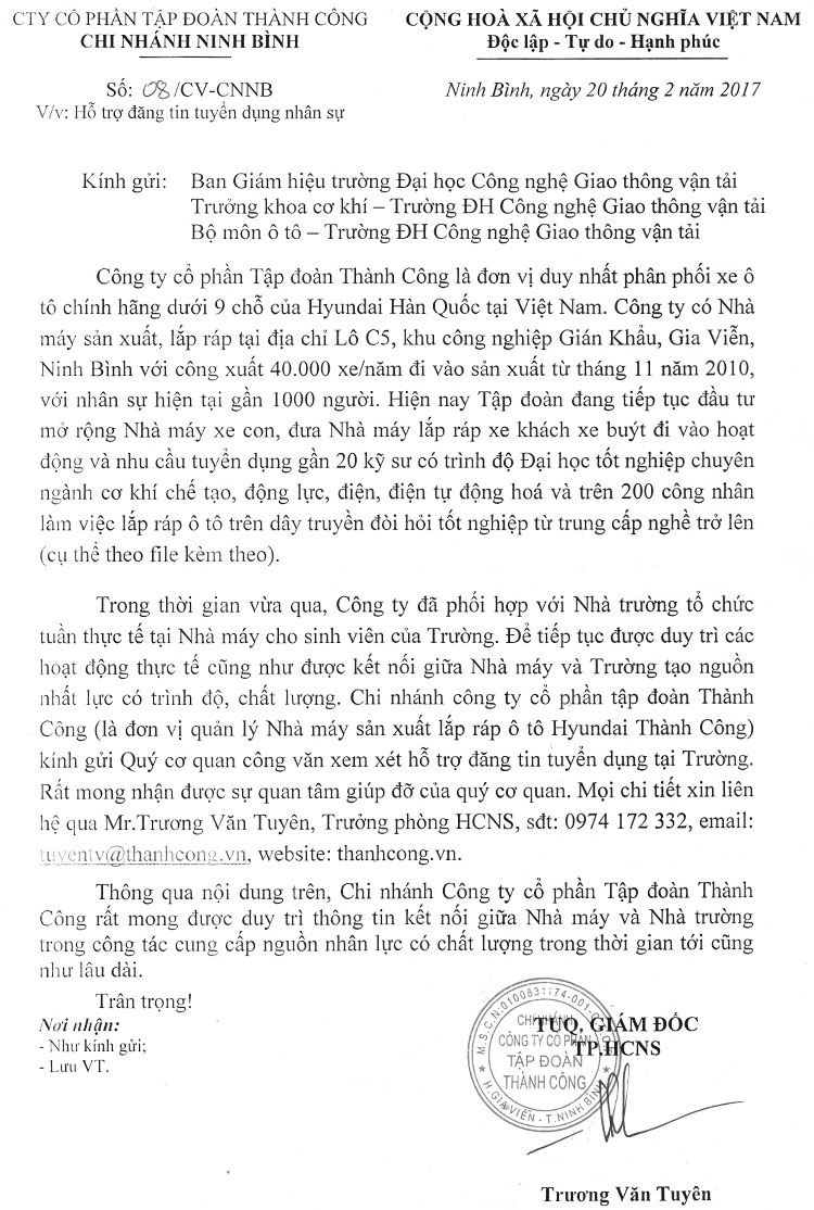 Thông báo Công ty CP Tập đoàn Thành Công - Chi nhánh Ninh Bình tuyển dụng Kỹ sư Cơ khí 28/02/2017 15:02 File đính kèm thong-bao-tuyen-dung-thanhcongroup-ninhbinh.pdf