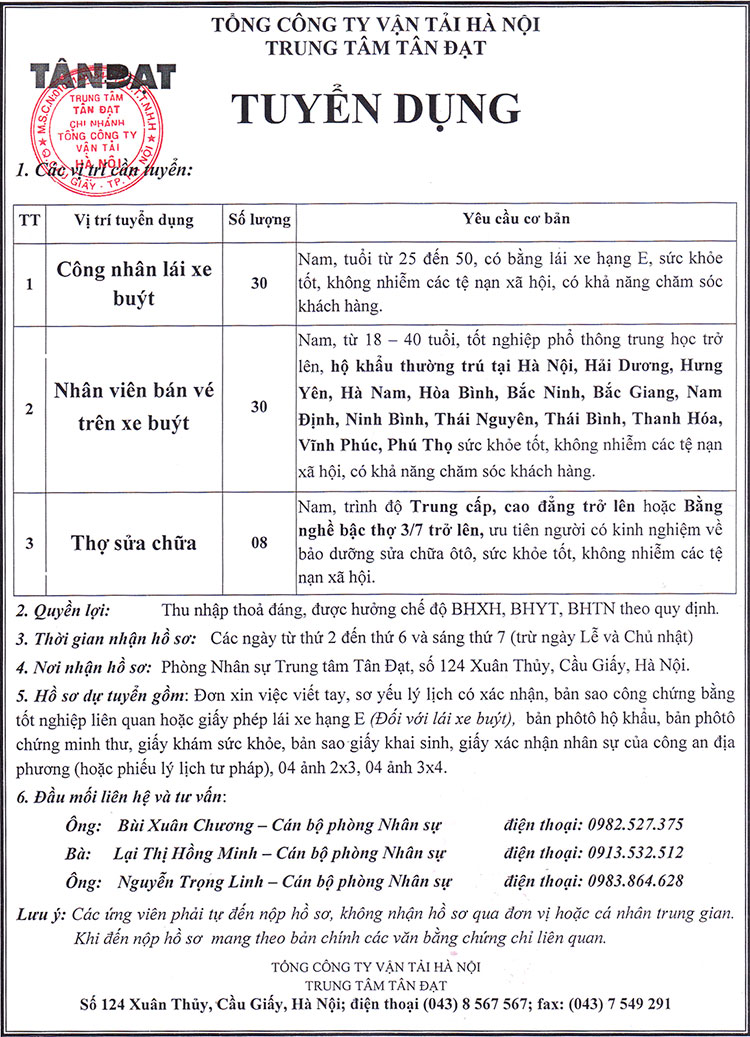 Trung tâm Tân Đạt (Tổng Công ty vận tải Hà Nội) tuyển dụng Thợ sửa chữa, bảo dưỡng ô tô 22/03/2017 08:03