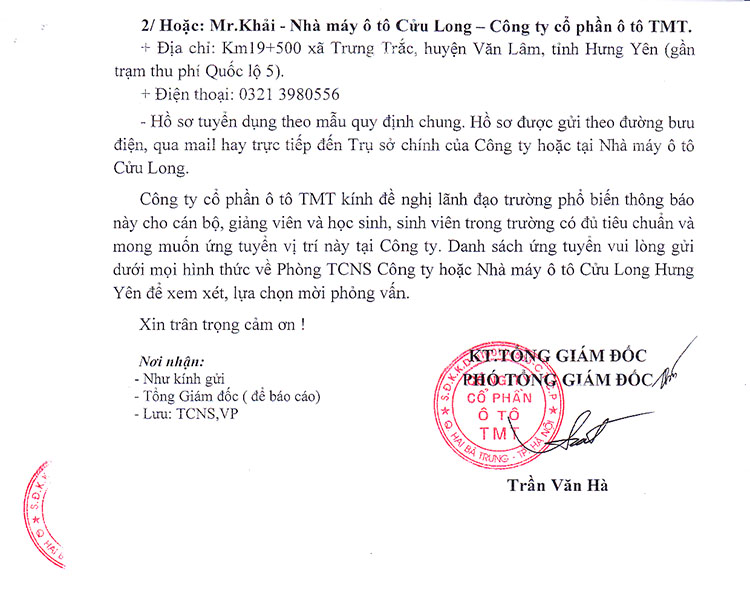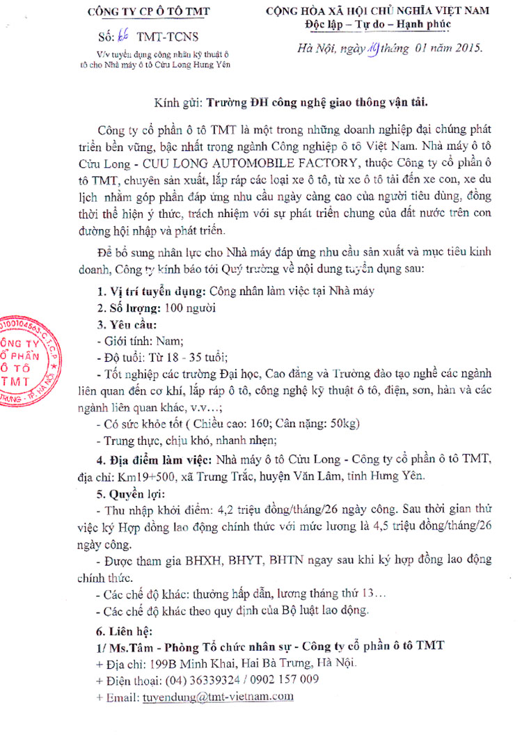 Tuyển dụng công nhân kỹ thuật ô tô cho Nhà máy ô tô Cửu Long Hưng Yên