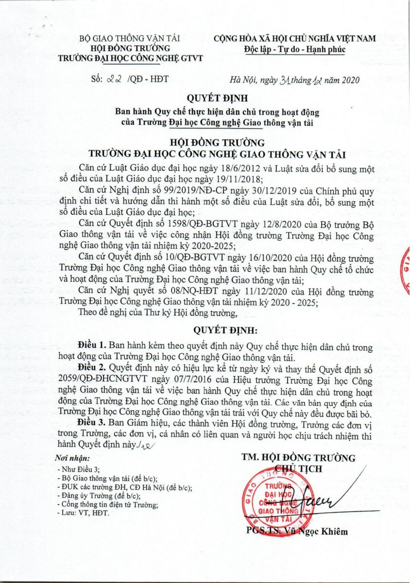 Quy chế thực hiện dân chủ trong hoạt động của trường Đại học Công nghệ Giao thông vận tải 29/01/2021 09:01 Chi tiết trong file đính kèm: File đính kèm 22-QD-HDT.pdf