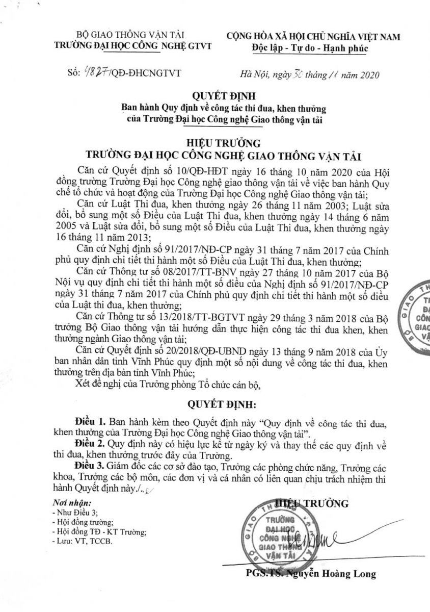 Quy định về công tác thi đua, khen thưởng của Trường Đại học Công nghệ GTVT 30/11/2020 10:11 File đính kèm 4827-QD-DHCNGTVT.pdf